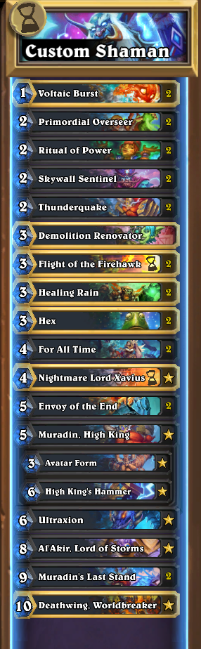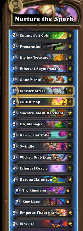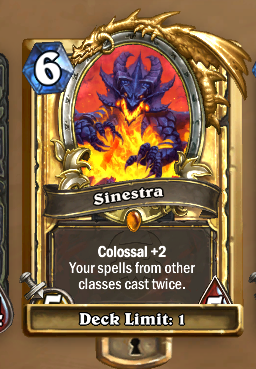 I made a fun deck in >>>>WildUnfortunately it hinges on RNG a fair amount by hoping to not get a garbage hero to change classes with on Maestra, but using Sinestra to give me Spell-Windfury I can crank out 40 damage by Turn 7 I've been using this to eat Quest Priests and way-too-greedy Ramp Druids