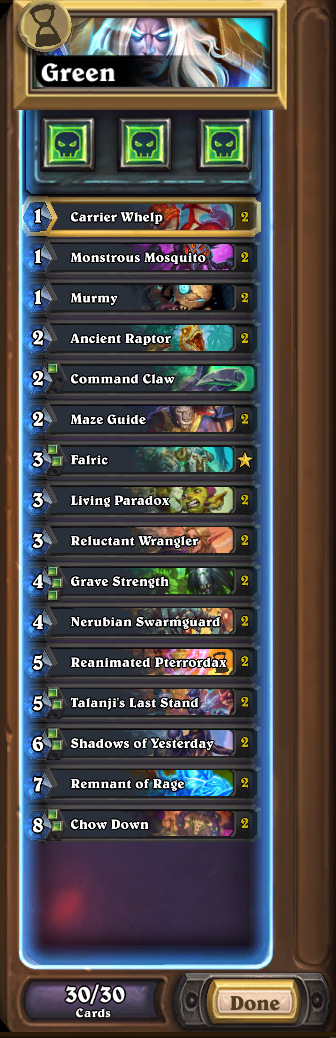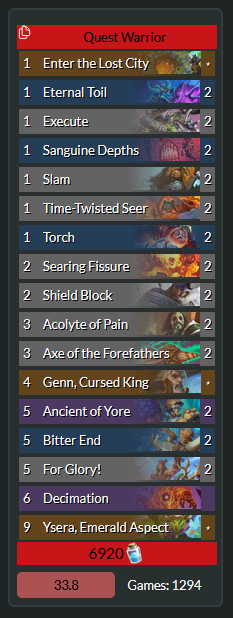 >>560848593Dragon warrior but heavier on the heralds than average, Sinestra and Burn MageThey all can beat Druid and it's enjoyable enough. Hunter is much harder but frankly Tol'vir is getting nerfed so soon that I'm considering it more like a funny "haha they thought this card would be balanced" thing more than anything.