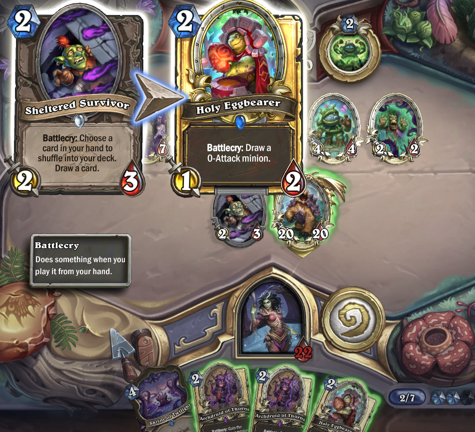 >>560847386By turn 3 or 4 or whatever the drood already has 4 2/2s that deathrattle into 2/2s and you're at 11 HPOr the warrior already put you at 11 HP by "getting lucky" with all their must-answer minions hitting face (they hit your face also)Etc etc you get the point