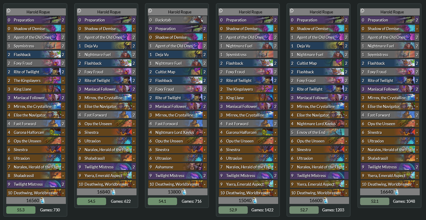 >>560847689>It always had a cassino identityDidn't that start with Kharazan? Anyway yea the casino gimmick doesn't make sense thematically and it's already shared with 2 other classes, while other unique mechanics specific to rogue are completely ignored. The 3/1 stealths are a good start.>Are they scared of giving rogue damage spells because it means potential removal or whatI reckon they don't want "uninteractive" otk decks but that doesn't stop them from printing egg support and other bullshit. More likely than that, they just want a couple of designated dice roll classes and rogue and mage just drew the short straws.Vanilla Leeroy miracle was my favourite, closely followed by infinite draw Edwin and kingsbane/dk hero. I could see why they wouldn't want to make the first 2 viable, but kingsbane was a neat idea and not all poison has to be face damage. Give them some utility, make them make the opponent's cards more expensive, I don't know. Maybe that'd be too annoying too. Still, hell of a lot better than "get a random spell with a discount"