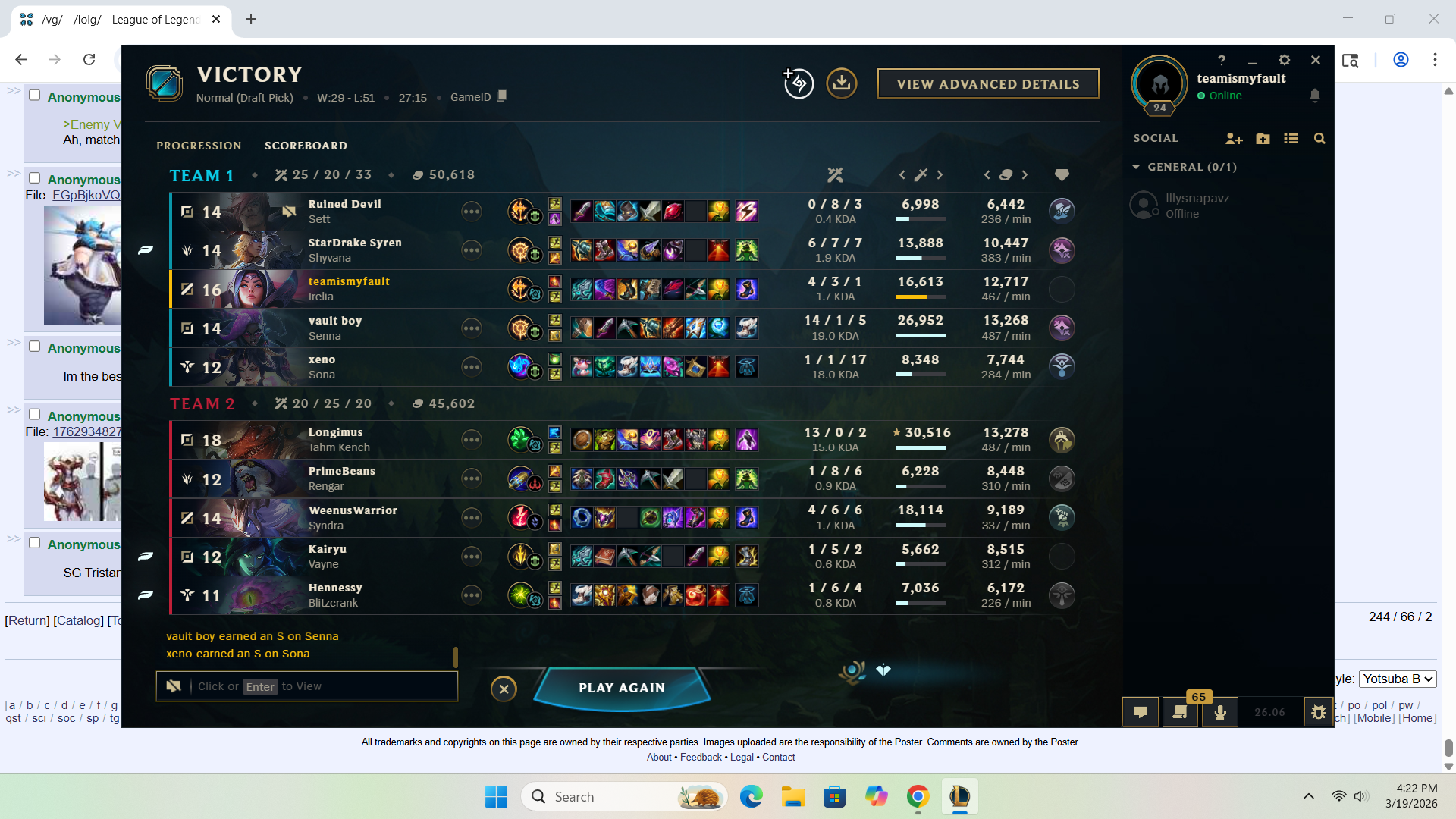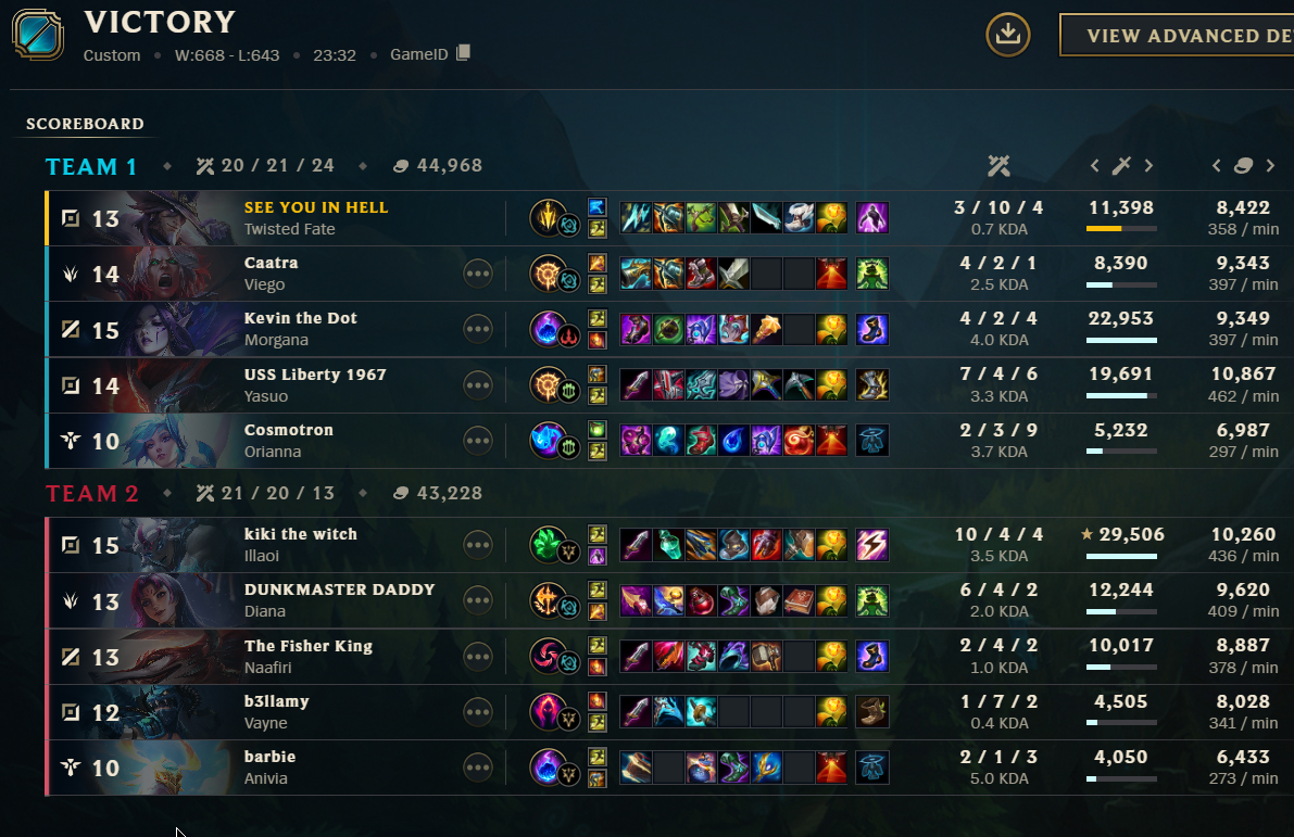 >>560862927That's what I 'did', or rather ended up to. I found I like playing Lux, I find her enjoyable to play and has some cool skins, I always play her mid or APC bot if I get secondary role. Sometimes it's funny to read when someone in the enemy team gets upset over losing against Lux. I didn't even realize how much I played Lux over the past months, and there are other champs I like in this game and it's the only reason I keep returning to it at this point.But the game itself is not fun, not enjoyable, every aspect of the game feels designed to be as frustrating and artificial as possible. Even damn Demacia Rising and other supposedly 'for fun' modes feel frustrating to play. This season I'm playing slightly less in comparison to last season (2100 ranked games by the way), because mentally I really don't feel like putting up with the garbage this game throws at you, from balance, teammates throwing tantrums, matchmaking - whatever.Whenever I play something else because I have enough of LoL, take breaks and such, I more or less remember what fun is. And it's ironic because LoL's garbage sticks with me even when I'm not playing it, the game is just that frustrating and at time even actually depressing. I have no idea at all how players look at the game and say "Yeah it's fine" when this season probably missed the mark as much, if not worse, than last season, and last season had Atakhan and Feats mind you.>you seen upsetI'm more than upset, yes.