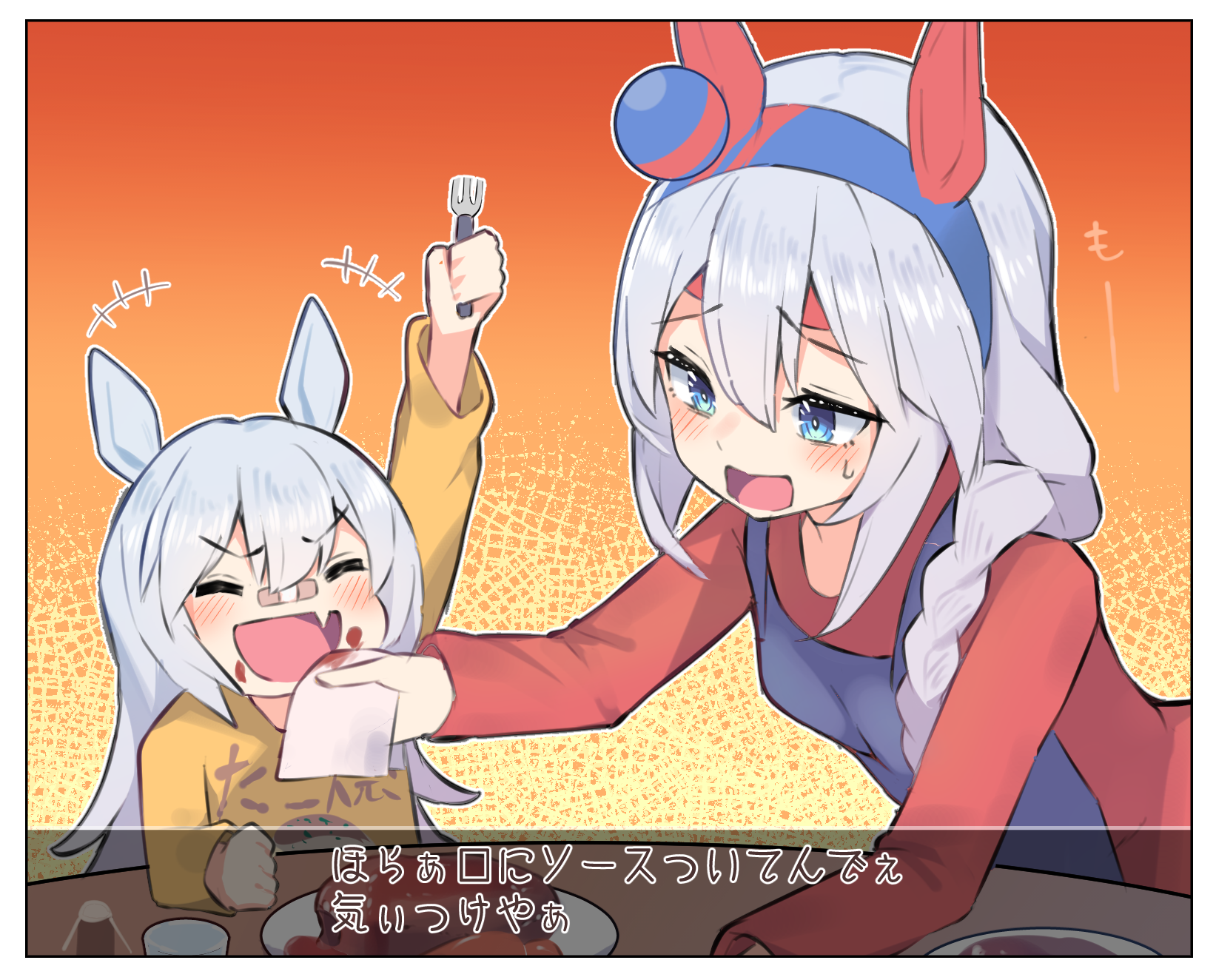 Ara, you got some rice on your face, Torena-san.Fufu, you're so hopeless.