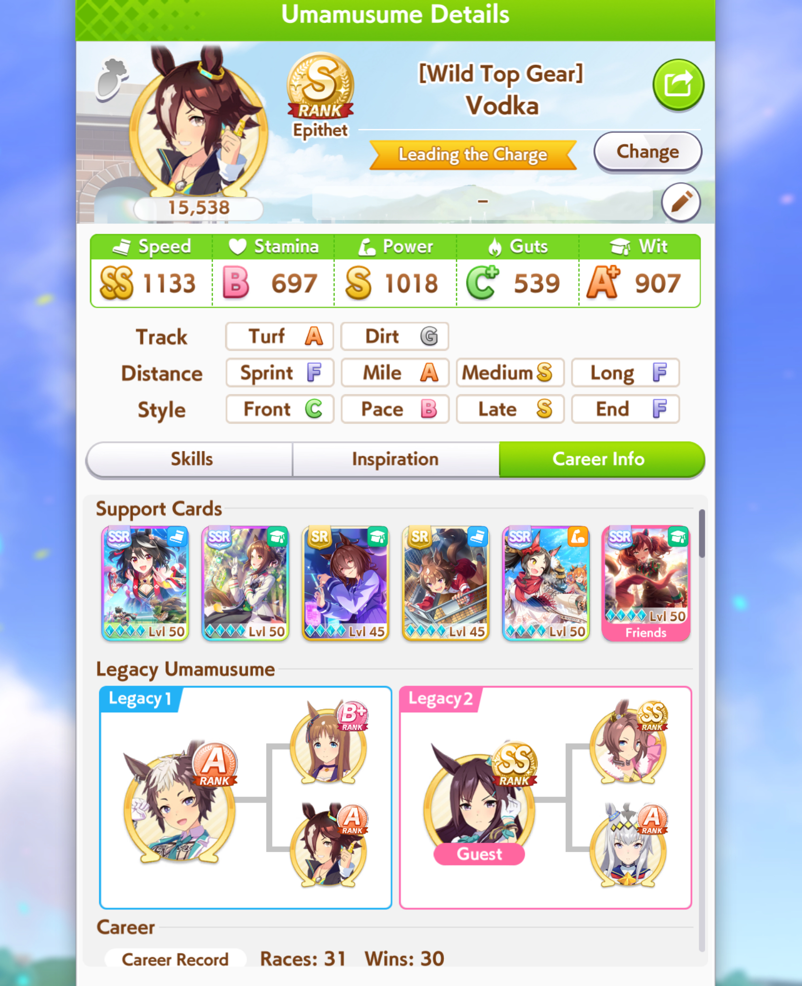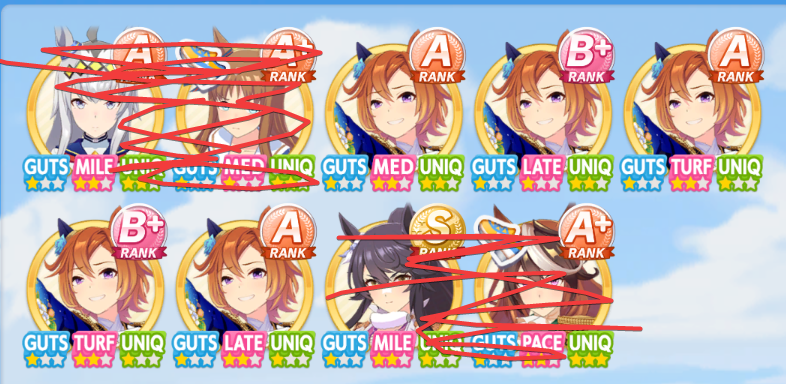 >>560862859How do you people do/tolerate guts decks? I did couple of Doto runs using freaking 4 guts cards and this is the garbage I get. Across two summers+finals I got like one double guts rainbow, finals had zero guts rainbows. I did a normal 2 speed/2pw/wit run afterwards and immediately got a usable S+ uma and that run also had non-rainbow summer turns.