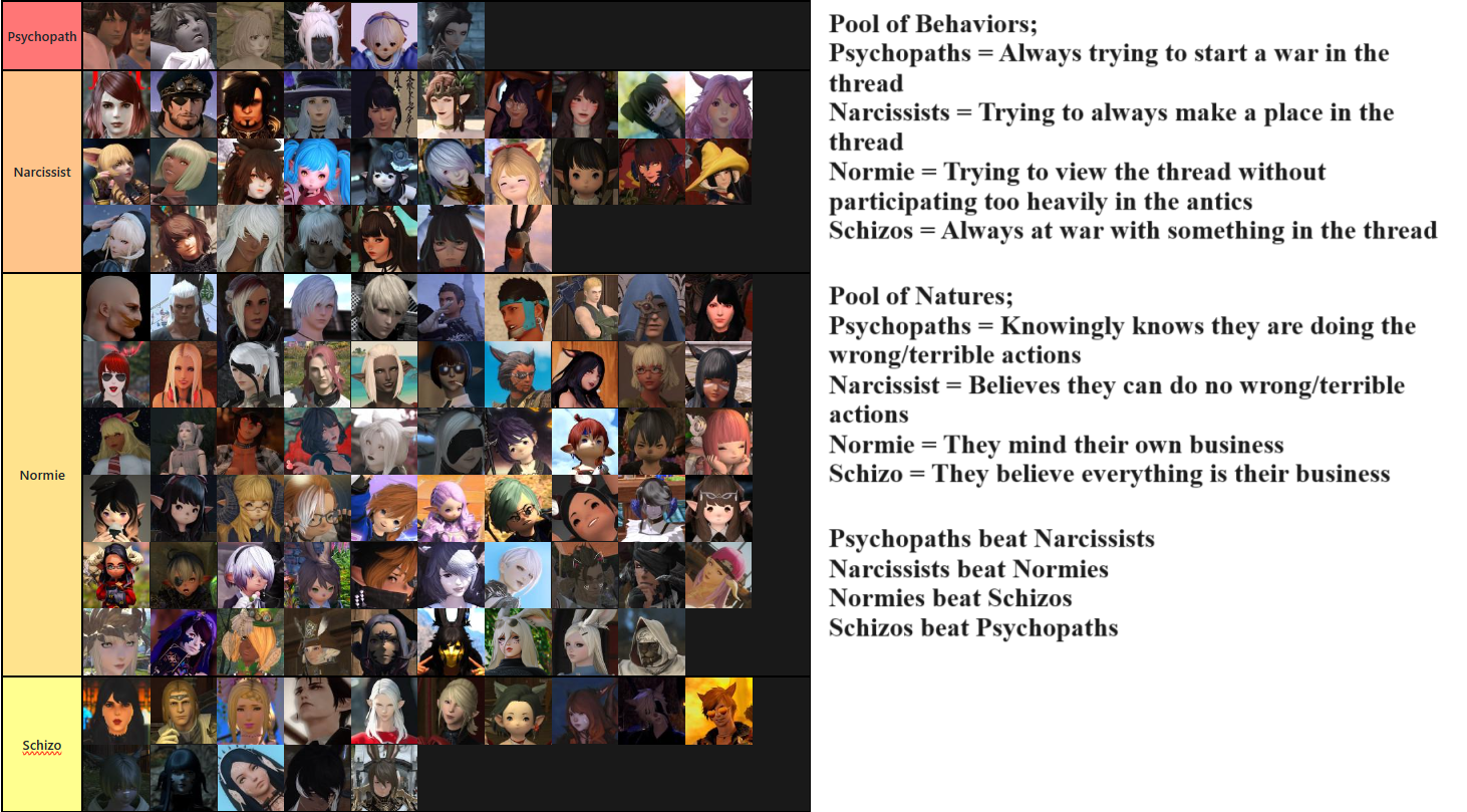 >>560875264The main weakness of schizo tirades is that they are unable to be replicated by outsiders, and this is the primary problem of all communities. Without proper teaching, they are unable to gatekeep their communities and then they are flooded with new DNA that changes the weather forever. Now the secondary problem, is that schizos and trolls despise working with one another and will eventually cannibalize each other to satiate their boredom. Why do you think it's always lalafell Discords imploding? Granted, you have to be unbiased and understand schizos, narcissists, psychopaths are non-conforming entities that behave as scientists do. They are not here to enjoy the scenery, but to change it. Not for anything positive or negative specifically, but to innately see if they are able to as a way to learn the environment. With more time given to thought, and more thought adjust to reason, it does seem like the "quality" and "nature" of a general is heavily dependent not on anonymous posters, but the avatarposters who are content and happy with the way the general currently is. For them, it's not a matter of quality, but it's a matter of quantity, as they must keep schizos, narcissists and psychopaths in check by making them feel like outsiders inherently. When they feel like they are the conversation, the topic and the blood of a general, they poison the system and then the normies are affected and soon to be burnt out entirely. Then in the end, your general is egos fighting over one another until they become tired.This is why they freak out when they are kicked from a house, barred from a Discord server and or not allowed in a syncshell. It puts them in their place.