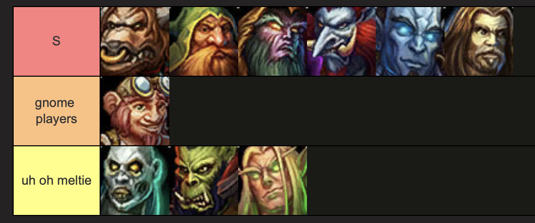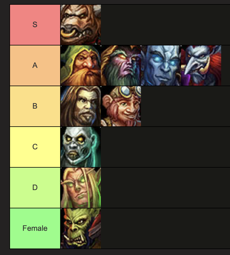 >>560990582I agree with your list and despise all bloodelf players but i also enjoy fem orc. The animations are great and they look good in armour. It's a shame they're now a troon max meta pick