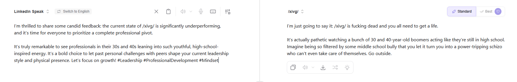 >>560921832Granted, you have to be unbiased and understand schizos, narcissists, psychopaths are non-conforming entities that behave as scientists do. They are not here to enjoy the scenery, but to change it. Not for anything positive or negative specifically, but to innately see if they are able to as a way to learn the environment. With more time given to thought, and more thought adjust to reason, it does seem like the "quality" and "nature" of a general is heavily dependent not on anonymous posters, but the avatarposters who are content and happy with the way the general currently is. For them, it's not a matter of quality, but it's a matter of quantity, as they must keep schizos, narcissists and psychopaths in check by making them feel like outsiders inherently.When they feel like they are the conversation, the topic and the blood of a general, they poison the system and then the normies are affected and soon to be burnt out entirely. Then in the end, your general is egos fighting over one another until they become tired.This is why they freak out when they are kicked from a house, barred from a Discord server and or not allowed in a syncshell. It puts them in their place.