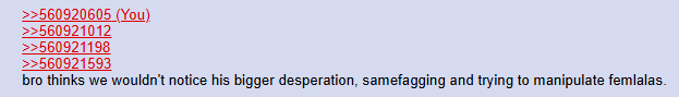 >>560921832All the decent people leave to their friend cliques cause retards like>>560922205 and macchi and kong are allowed to shitpost without catching bansI mean look at that gigantic loser retard thinking this is some battlefield instead of going outside, touching some grass and realizing it's just a 4chan thread