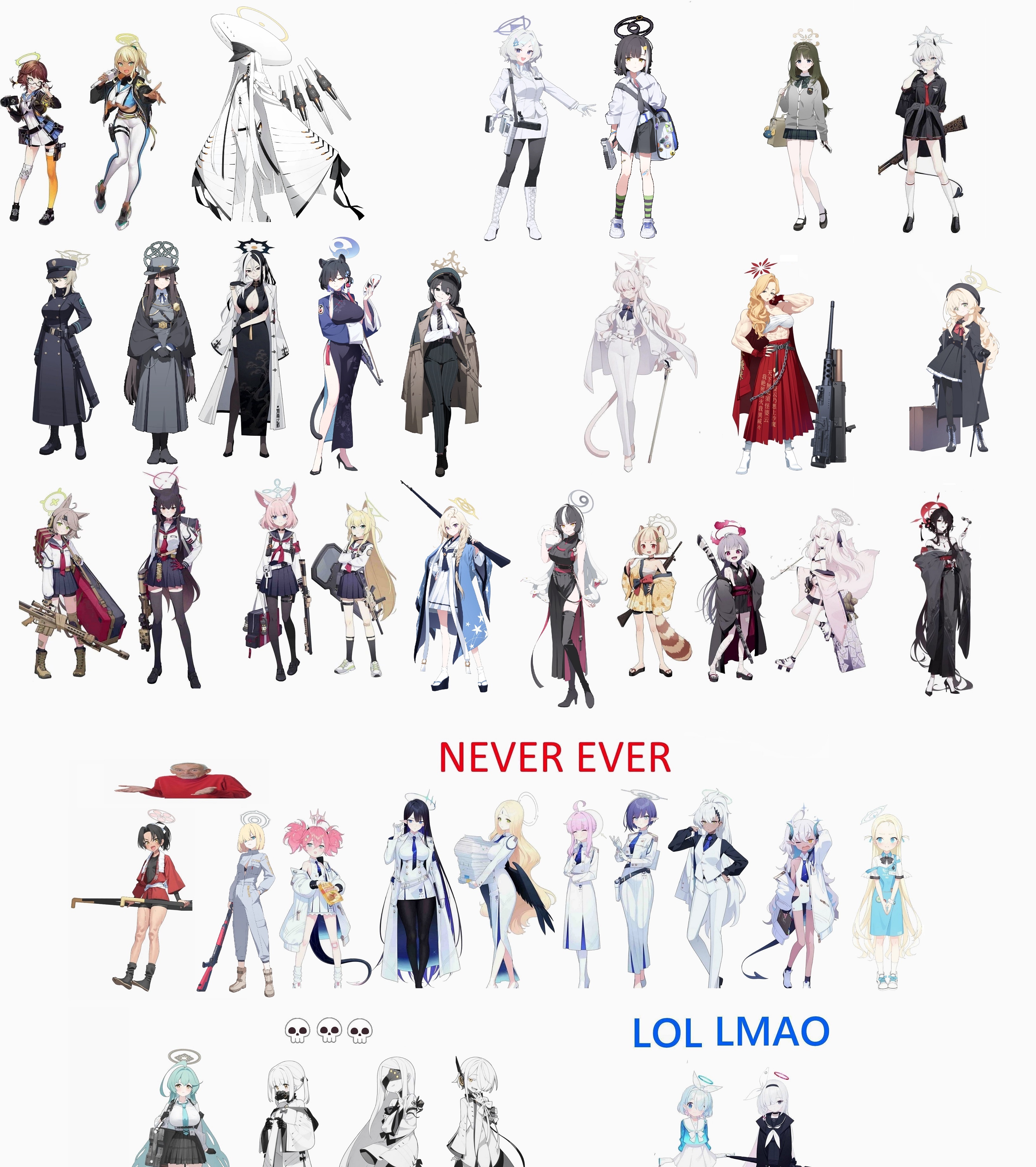>>560936223nigga just say you don't want to do it instead of finding excuses. most of those are students most people would have. some of them are must-pull fest banners, others are meta picks for any raids, others like Serina and Mari are students everyone gets for freethe 2 Hoshinos would need you to get spooked during fest so I can see not having them if you started less than a year ago, and I can see not having Noa because she's more niche and a lot of people probably didn't roll for her banner, but literally everyone else is a must roll in that pic