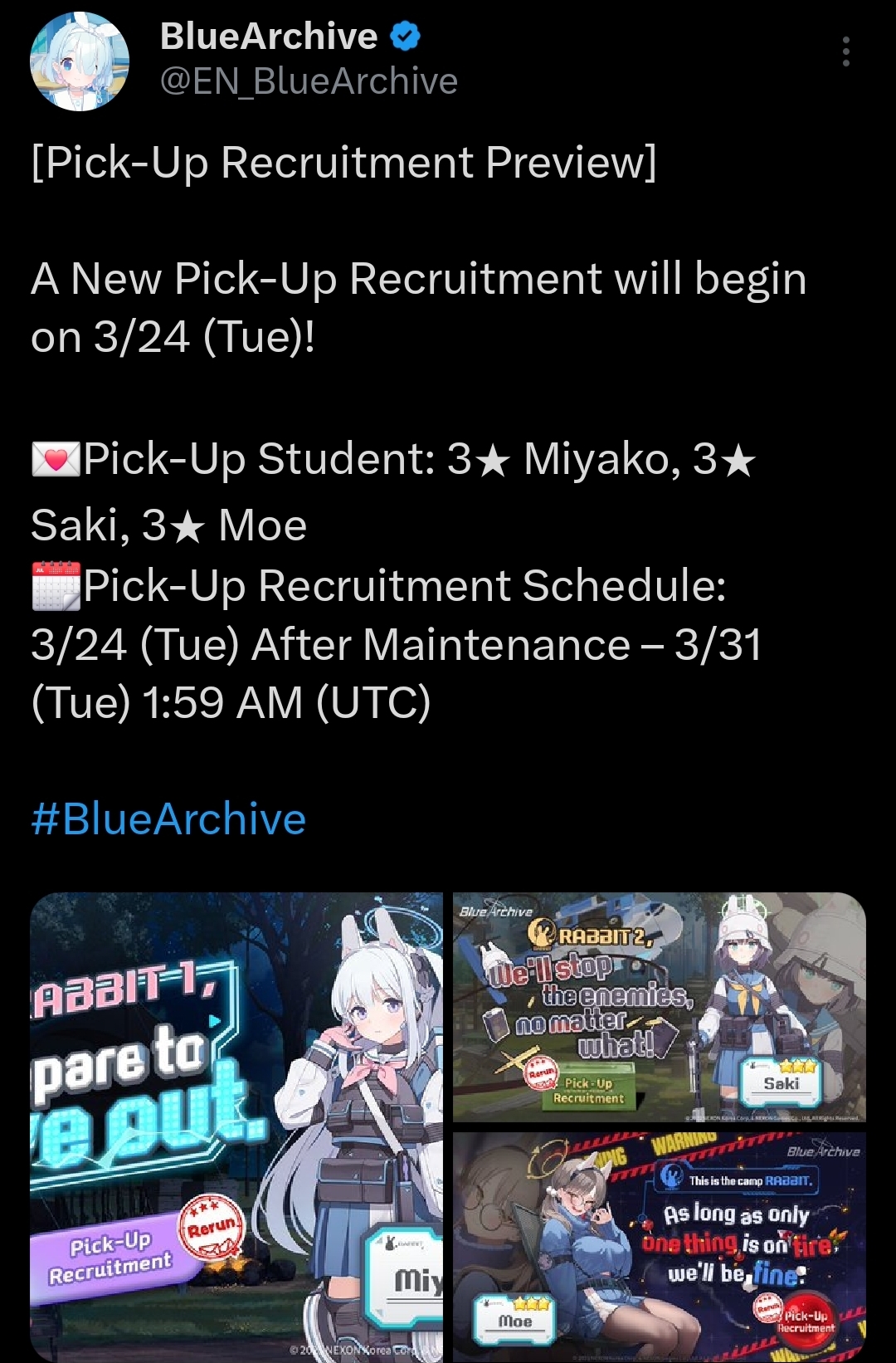 Previous Thread: >>560886835>Guides, Resources and useful links:https://rentry.org/bagguides>/bag/Circles/Clubs/Friends:https://rentry.org/holdingthebag>4koma, Manga, Side Content, PVs & Shortshttps://rentry.org/bacontent>>(JP) – JST>Banners:>18/3 After Maint – 4/1 10:59KonokaRena>News:Patch notes: https://bluearchive.jp/news/newsJump/642>Events:Kivotos Unsolved Mysteries: The Great Tsuchinoko Investigation to Ward Off Evil – 18/3 After Maint – 4/1 10:59>Content:Total Assault: Goz (Field) – 3/25 11:00 – 4/1 3:59Limit Break Assault: Tiphareth (Indoor – w/Elastic Armor) – 3/19 11:00 – 4/21 3:592x Bounty – 3/18 4:00 – 3/25 3:592x Account EXP – 3/20 4:00 – 3/23 3:592x Normal – 3/25 4:00 – 4/1 3:592x Account EXP – 3/28 4:00 – 3/30 3:592x Lesson/Scrimmage – 4/1 4:00 – 4/8 3:592x Hard – 4// 4:00 – 4/15 3:592x Commissions/Bounty – 4/15 4:00 – 4/21 3:59>>(GLOBAL) – UTC>Banners:>3/10 After Maint – 3/24 1:59Suzumi (Magical – Limited)Reisa (Magical – Limited)Rabu (Welfare)>News:Coupons: MAGICALVIGILANTE / BOLTCATCH831 / HEAVYCALIBER310 – 3/10 9:00 – 3/24 1:59Coupon Guide: https://rentry.org/CouponBAPatch notes: https://forum.nexon.com/bluearchive-en/board_view?thread=3393151Roadmap: https://bluearchive.nexon.com/events/2026/03/update>Events:Magical Girl Heavy Caliber: Era's Ambitions and the Qualifications of Justice – 3/10 After Maint – 3/24 1:59My Office: https://bluearchive.nexon.com/user/myoffice>Content:Total Assault: Yesod (Urban) – 3/17 2:00 – 3/23 18:59Limit Break Assault: Tiphareth (Indoor – w/Elastic Armor) – 3/11 2:00 – 4/6 18:592x Commissions – 3/16 19:00 – 3/23 18:592x Account EXP – 3/20 19:00 – 3/22 18:592x Lesson/Scrimmage – 3/23 19:00 – 3/30 18:592x Normal – 3/30 19:00 – 4/3 18:59