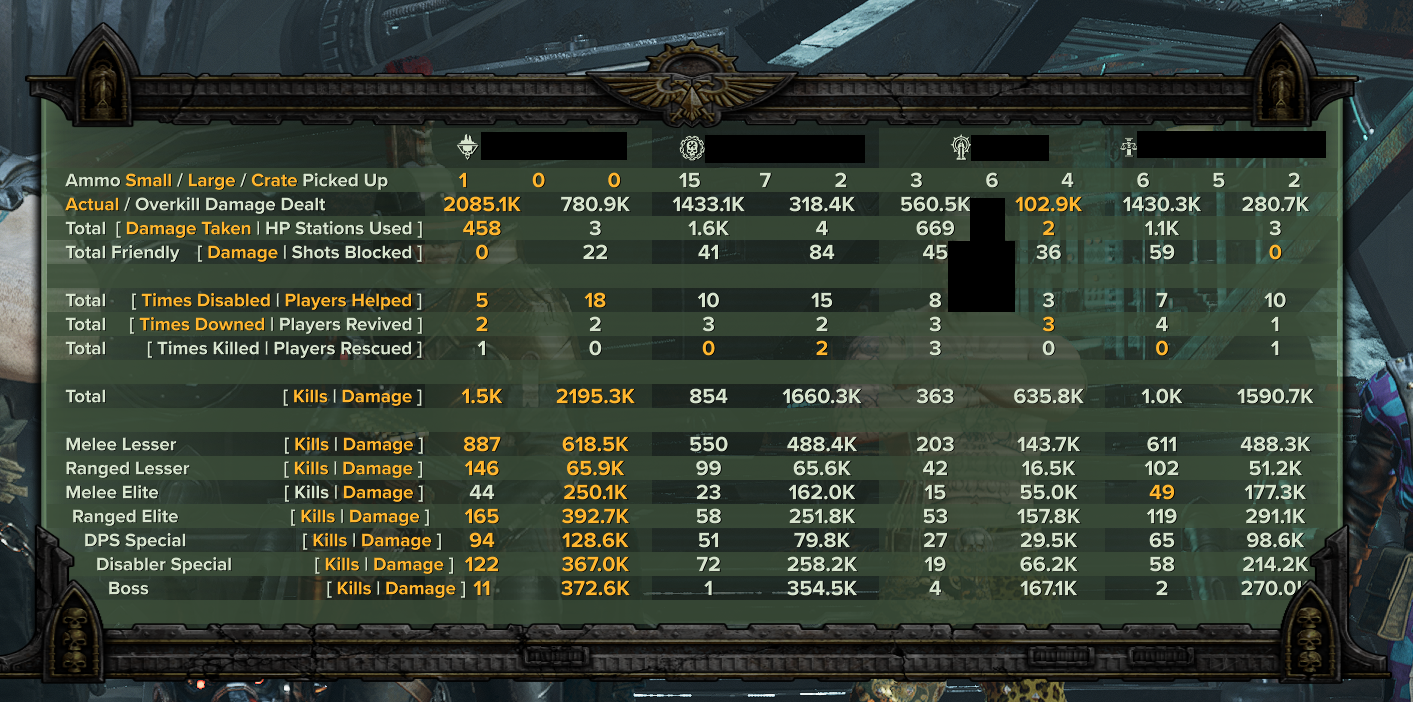 >>561015705>The only possibly meaningful scoreboardposting would be comparing personal performance across multiple games and classes. Even that is a flawed indicator.Yes, but that's underselling just how misleading the scoreboard can be, because certain metrics just aren't recorded, or, contextually speaking, are extremely difficult to quantify. How the fuck are you going to measure how much damage output the scum was allowed to do because Chorus enabled Skullcrusher and knocked the boss into a corner? There's always a non-zero chance that someone perfectly times Skullcrusher when the scum yells at the boss, and then the vet yells at the boss and throws a krak, and that's the same amount of stagger and the boss is now dead. How much value would chorus provide in no longer needing everyone to use their abilities and grenades? I don't think this is even equivalent, or quantifiable without an absolutely humongous data set, and even then it's extremely tricky. Such situations are just too complex.Realistically, scoreboards are functionally useless when it comes to measuring the impact of a "support" class/build, which I still strongly believe zealot excels at. Thammer is only good with chorus, stealth RB is okay but disgustingly outclassed by scum, so "damage" zealot builds might as well not exist anymore in the meta.>Every class is full of troglodytes. No need to single one out. There're plenty to go around.Also disagree. I've found h40 ogryns to be among the most consistently good players, especially on NA. Granted, that is after filtering their builds, but I have to do very little filtering with ogryns. Vets tend to be the most obviously retarded when they don't bring field improv, so they're easy to filter. Zealots on the other hand, have been so consistently bad in my experience, that it's a breath of fresh air when I find one that doesn't suck.Also psykers seem to be the most helpless and die useless deaths the most. They're either gods or dogs.