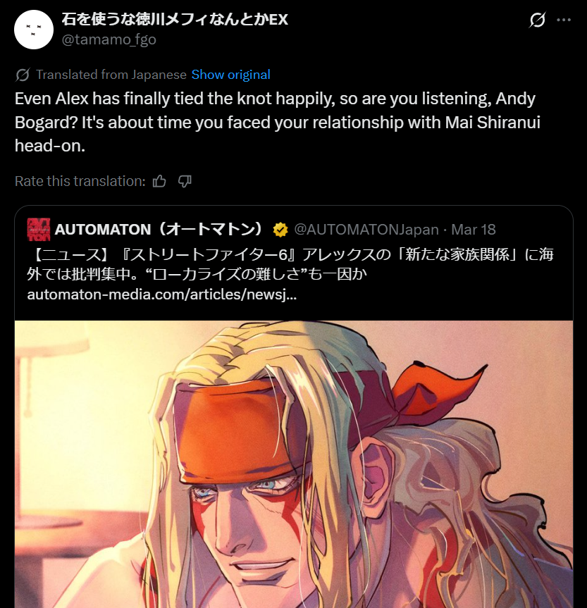 https://x.com/StreetFighterJA/status/2035174649412350288?s=20capcomusa is doing crickets meanwhile japan SF Twitter>heres our COMISSIONED ART for artist Taikyo Rose, todays art is manon and her fuck boi Jamie