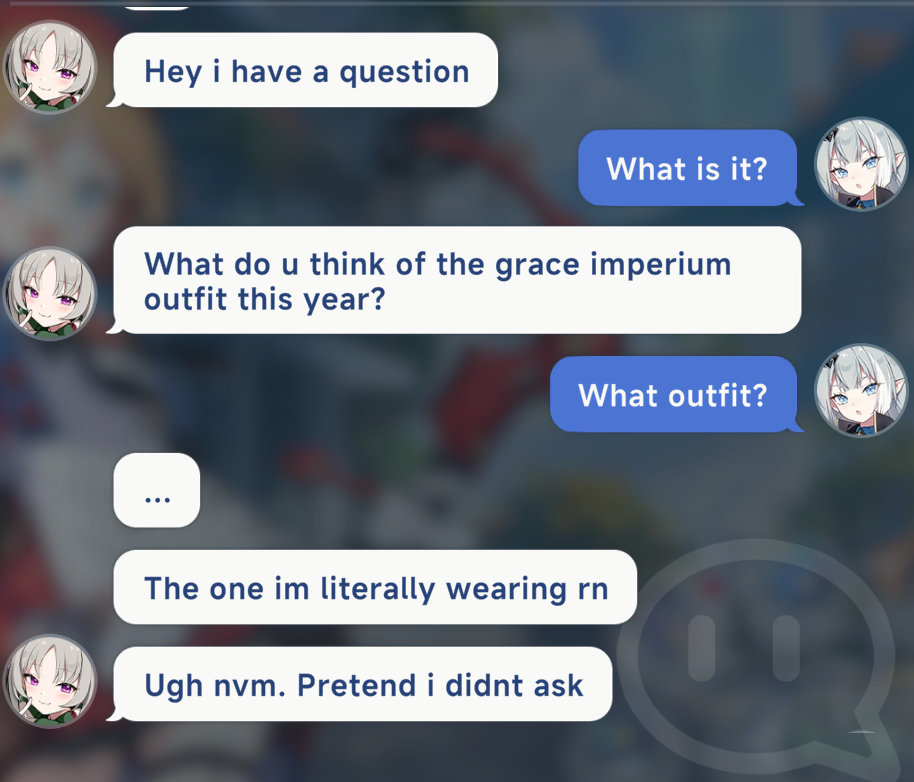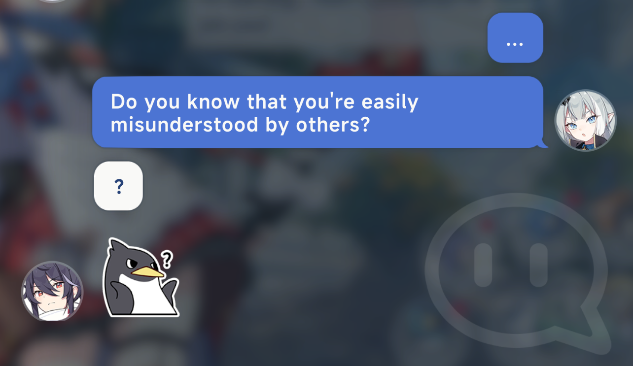 >>560967383They all have different ways of typing which is a nice detail. >Laru lazy types and hardly capitalizes>Ridge never uses capitalization at all>Kasimira is autistic and overly formal with her texts>Ann has difficulty typing so she sends multiple single word texts or emote spams>Nazuna uses stickers in every text convo you have with her>Chitose always starts her texts with "My lord/lady">Shia shortens alot of her words eg: "how r u doin?">Gerie's texts are very wordy