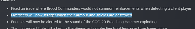 If I'm using peak physique and shove a massive fixed bayonet into an overseers chest after destroying the armor it should die or at least be flinched
