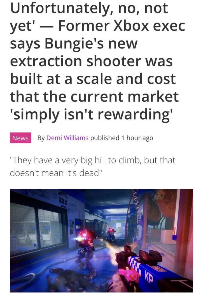 >>560970540They wanted to copy what made the raids work in D2, because that would always bring tons of attention to the game whenever one launches. But that doesn't translate into sales because its usually just existing players hopping between streams to see which player made the most progress, because the difficulty of the content and in getting together a coordinated fireteam filters out most of the players. In this case it fails because Marathon is a PvEvP game and NOBODY wants to lose all to loot they spent time grinding for, especially if they're a bunch of yellows that end up benefiting someone else.