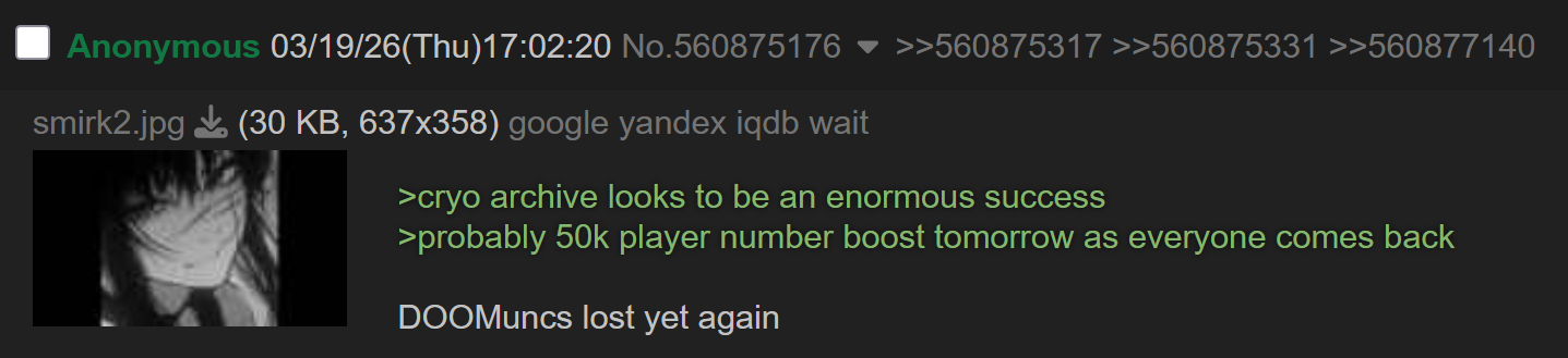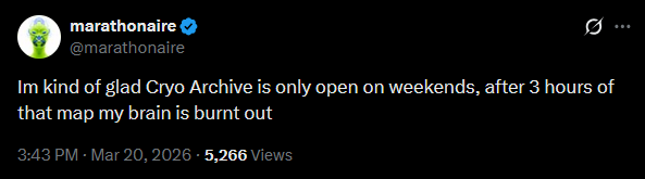 >big Cryo Archive opening weekend is supposed to be a celebration>turns out to be an open casket funeral and weekend long wakeRest In Piss, Marathon, I’m sure the streamers won’t miss you