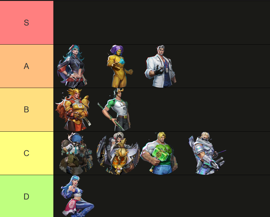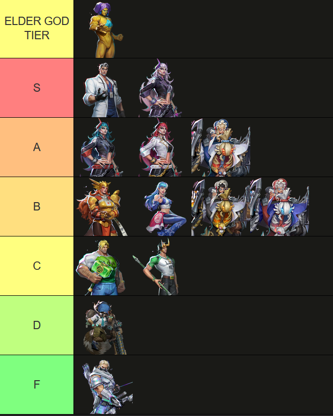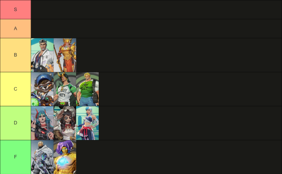 >>560976539I'd probably rank A and B a bit higher just so that I can put Thor in a B rank of his own. I really like his hammer but the rest of the skin does nothing for me.