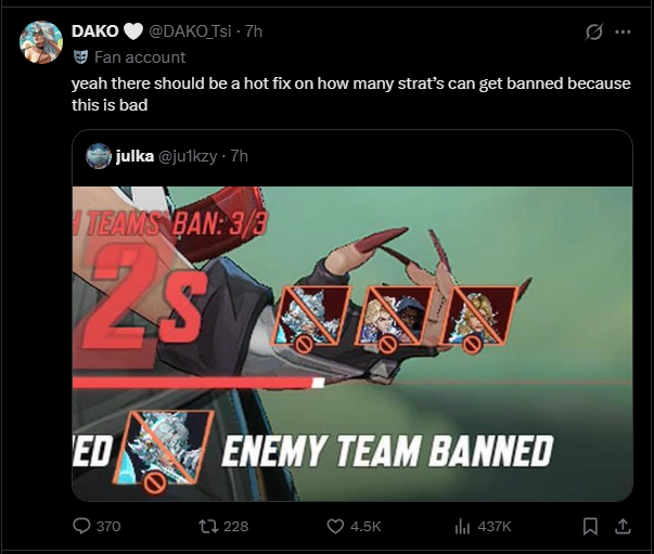 >>560976171>Actual balanced character with a balanced ult with a support kit that should've been a standard for support characters.>Retard strat mains on the sub and xshitter , (usually OTPS), are gonna bitch and whine to daddy Zhidong she's not a press Q to win every game support and try to get her hyper buffed.They should just go back and nerf all the braindead supports to be more in line, till then just ban Gambit, CnD, and Sue if you plan on playing White Fox.It's fucking hilarious with the bans right no, cause now they have to pick up heroes like Ultron lmao