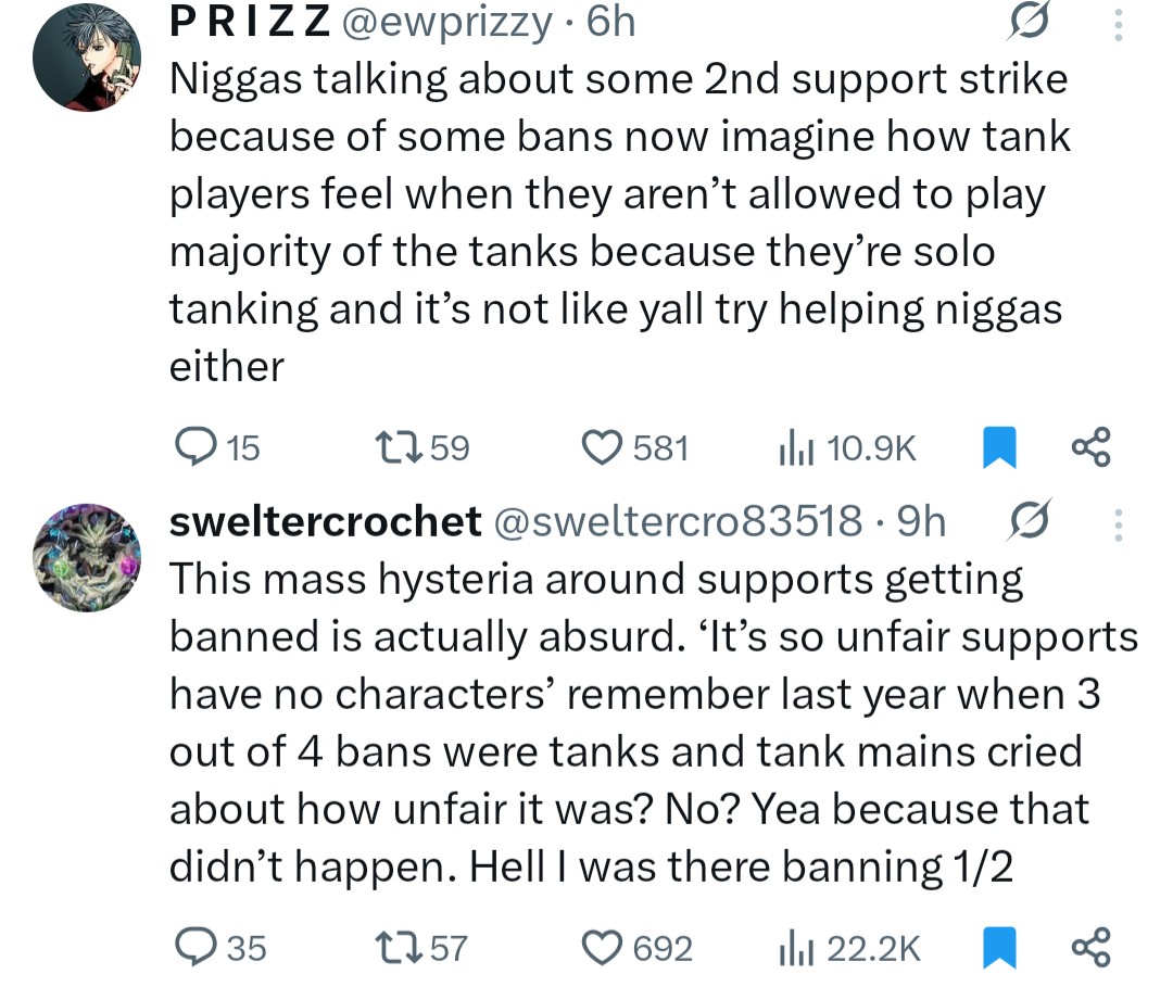 >>560979853supports being almost totally banned out constantly would be less of an issue if>they actually acknowledged how fucking stupid the best supports are>the game had more supports in general because as it stands you can ban out like half the rolethe DPS roster is disgustingly bloated, the only reason people meme about shit like making Cyclops a Vanguard or Strategist is because more than making sense the game needs actual variety over perfect accuracy and we're already insanely spoiled for choice on selfish damage carries