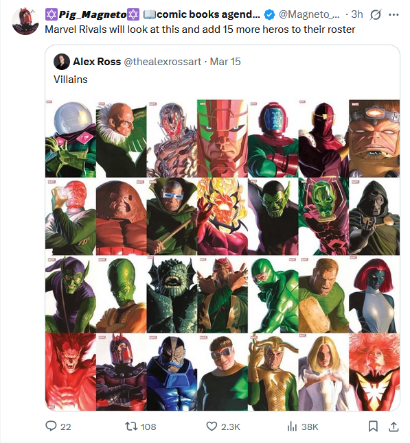 >>560977837>Green Goblin - Flying DPS or Tank (Classic mode, not Ultimate roided out)>Doc Ock - Tank (Use tentacles to absorb damage, be able to have expert maneuverability on walls)>Electro - DPS (Think Tracer blinking combined with Winston gun)>Mysterio - Support (Make clones of allies to trick opponents, can do additional damage/healing based on teammate selected)>Sandman - Tank (Make several sand-shapes/constructs)>Scorpion -DPS (Long-range tail swipes plus damage over time effects from landing skills)>Dr Doom - Tank (No ideas beyond that just look at his build)>Abomination - Tank (Honestly might be similar to Hulk but he's cool, and we need more RIVALS in RIVALS)>Taskmaster - Omni Role (Rogue but better, let him copy an enemy skill while having his own skills change based on the role of the character he copies)>Bastion - DPS or Tank (No ideas he was just cool in 97)Honorable mention for Mr. Sinister who I considered adding for another Support mention (maybe related to his genetics work) but I liked Bastion more. Extra hard mode would be no Spider-Man villains but I like them too much to try and avoid picking them.