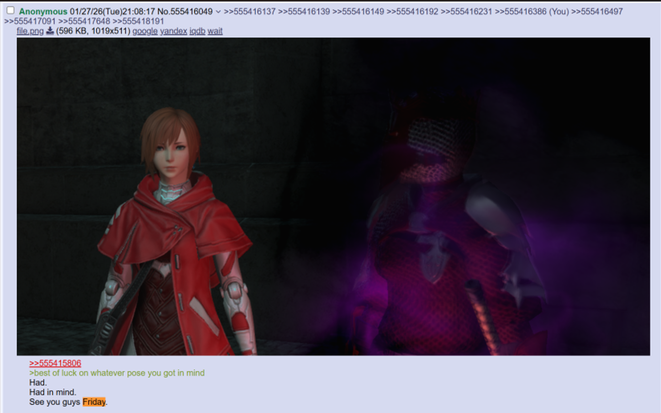 I don't want to avatarfag, but I really like sharing my character, therefore I often attach pictures of them, but try to take different ones every time. I hope other users don't find that annoying or low-effort