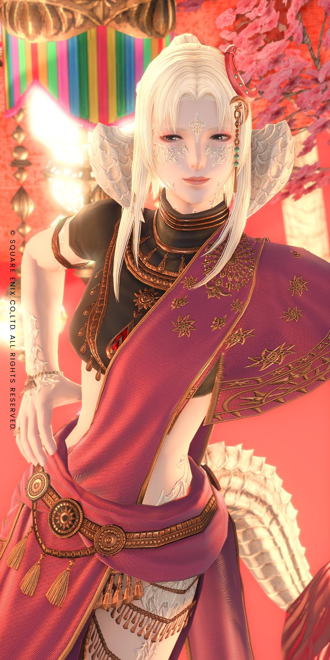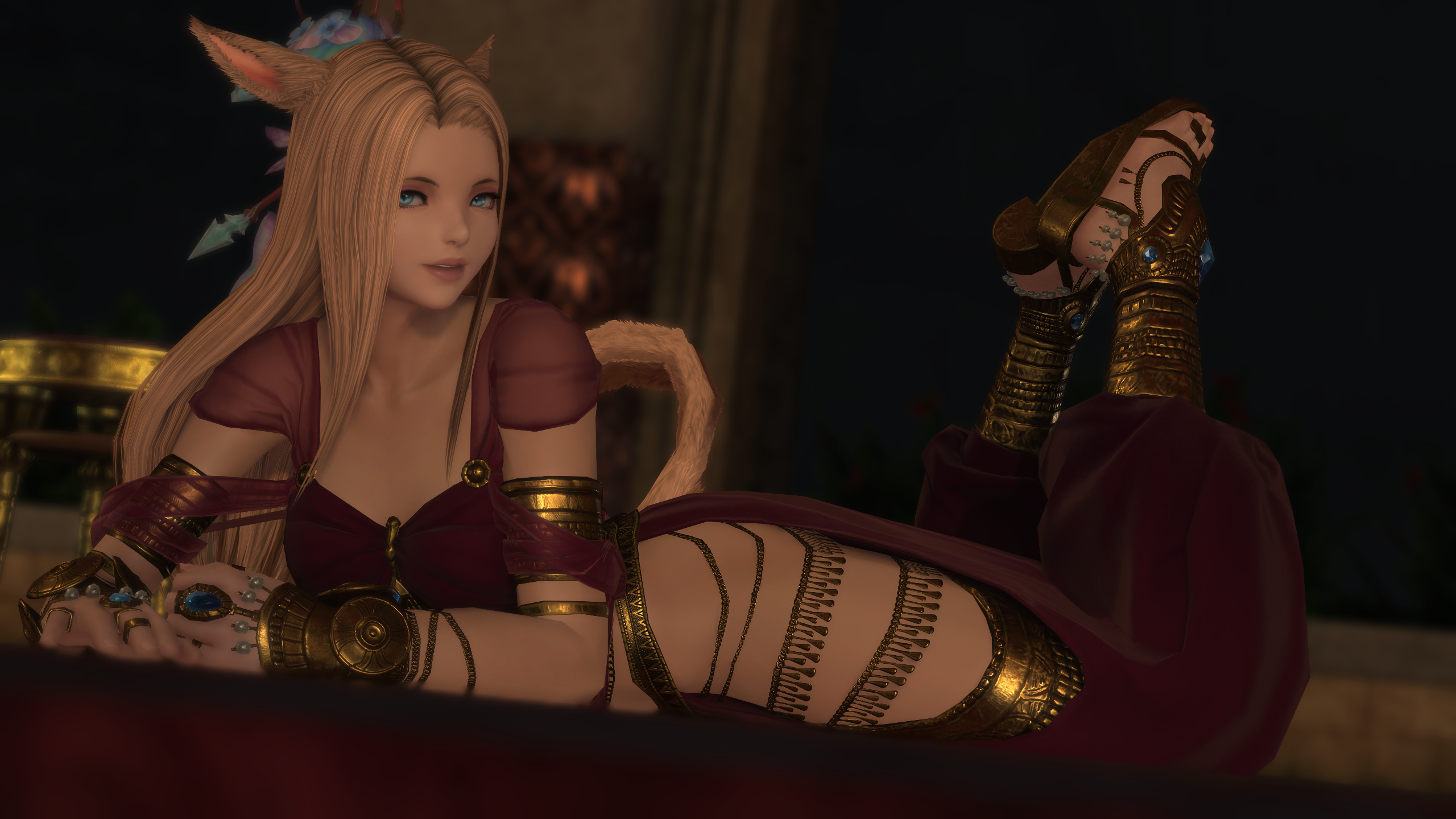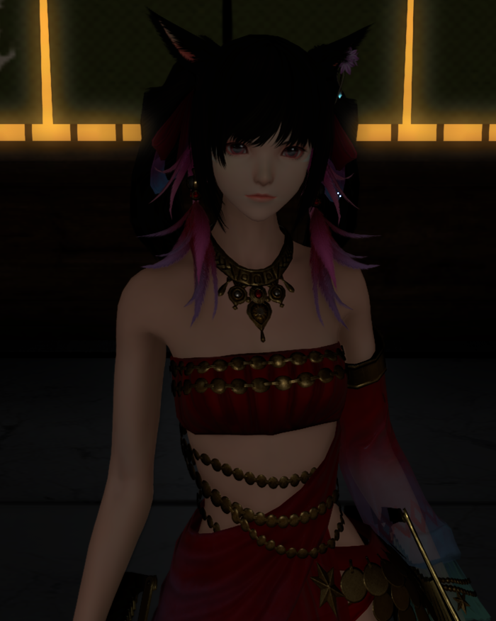 my femra is experimenting with new color palettes. she is more of a pastel and pink person but she's decided to try putting salmon pink into her frilly and lacey glams as a sort of feminine "beginner's orange"...