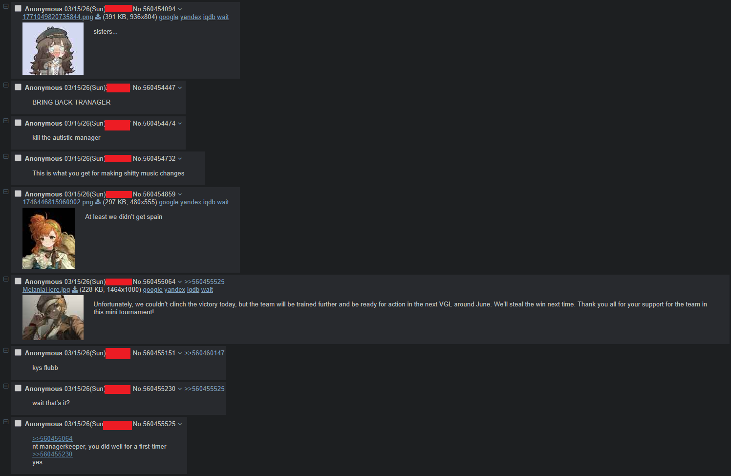 >>561043138Yeah. Never bad enough that you think they'll get sent to qualifiers. Never good enough. Have only won a single Ro16 and then immediately lost in quarters, their best finish in 19 VGLs. Historically bad so can't point to some random VGL8 run as a peak. Since that one quarter their group finishes have been 2 points, 3 points, 4 points (died in SR1), 3 points. /aceg/, /pmmm/, /hbr/, /smbg/, and /omg/ are also good current contenders for the line but still feel like /skg/ matches it the closest.