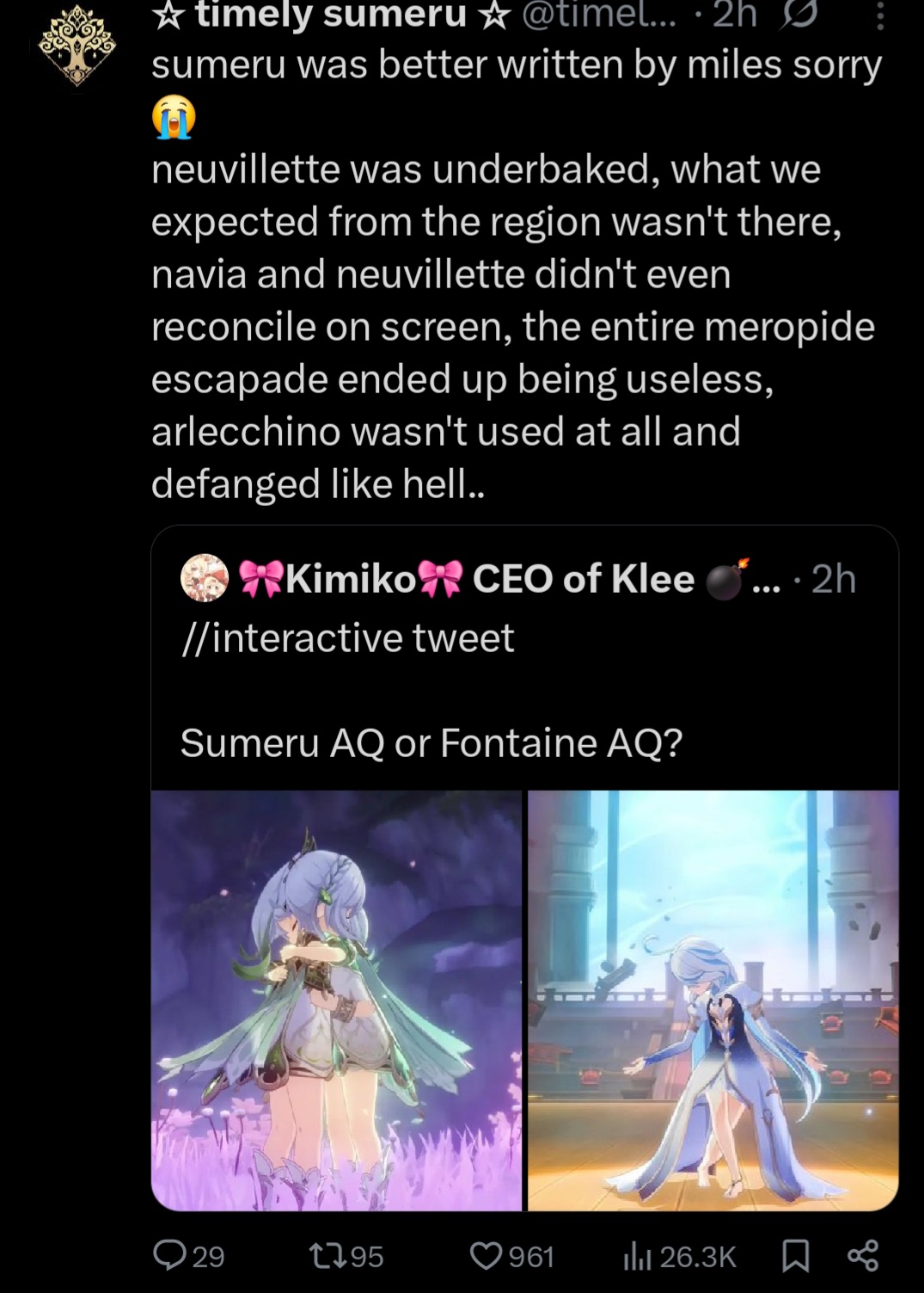 >>561058367Natlan gets a lot of hate, but some parts were good.Citlali - best characterOchkanatlan - best explorationhttps://youtu.be/JwDtuy8En8o - best musical themeVaresa - best gameplayPrelude: The Journey Home - best archon quest