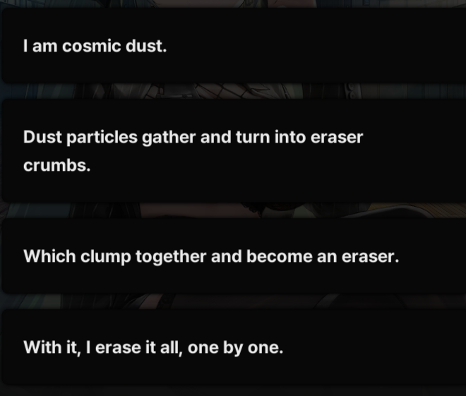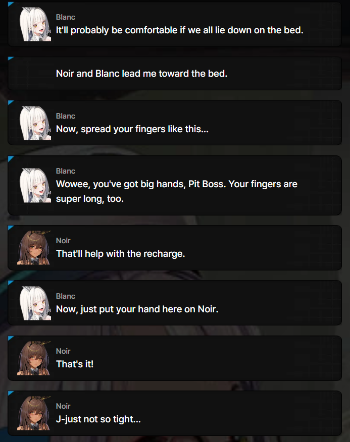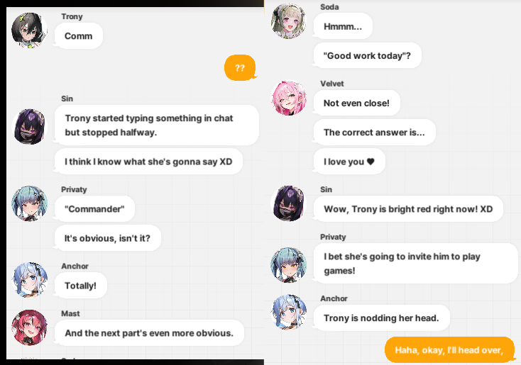 >>561046271>Arcana, Privaty, Zwei, Ein, Rei and Amy in the chat>Arcana tells everyone how they fucked for hours and are going to skip class to fuck some moreI'm not ready for School Days ending