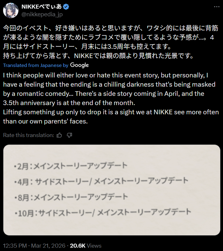 >Game Download - Android/iOS/PChttps://nikke-en.com/index.html>General Info/FAQ for New Playershttps://rentry.org/NikkeInfo>Additional Linkshttps://rentry.org/nikghomeALL DATES/TIMES LISTED BELOW ARE UTC+9 (KOREA TIME)>Update on March 19https://nikke-en.com/newsdetail.html?content_id=a1ffdf10aaa16a4ccaa96aaacadf61480c22>Developer's Note: March 2026https://nikke-en.com/newsdetail.html?content_id=835e7b26a7fafa4df8ab738a81b2b9f6aa3a>Current EventsDating Sim Story Event: 2X2 LOVE - March 19 ~ April 9Solo Raid: Crystal Chamber - March 20 ~ March 27>Upcoming EventsCo-Op: Chatterbox - March 27 ~ March 29>Current Special RecruitsArcana: Fortune Mate - March 19 ~ April 9>Current Costume PassesTwo: Spring Stroll [Mission Pass] - March 1 ~ March 31Privaty: Sharp Lesson [Costume Gacha] - March 19 ~ April 9Vesti Tactical Upgrade: Pure Beginner [Mission Pass] - March 19 ~ April 9>Upcoming Costume PassesViper: Punky Street [Mission Pass] - March 26 ~ April 16Sora: Spring Flight [Mission Pass] - April 1 ~ April 30Clay: Cheer Up Training [Login Event] - April 2 ~ April 30>CodesMILLIONCOMMANDERS (04/30/2026)Previous: >>561004812