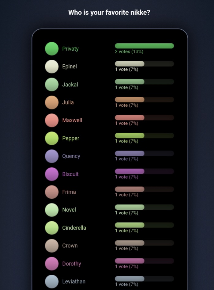 >>561084826My favorite nikke has a modest but dedicated fanbase, which I think is the happiest medium to be in.I still post other nikkes too because you can post multiple things in a thread and nobody will call you out for it.