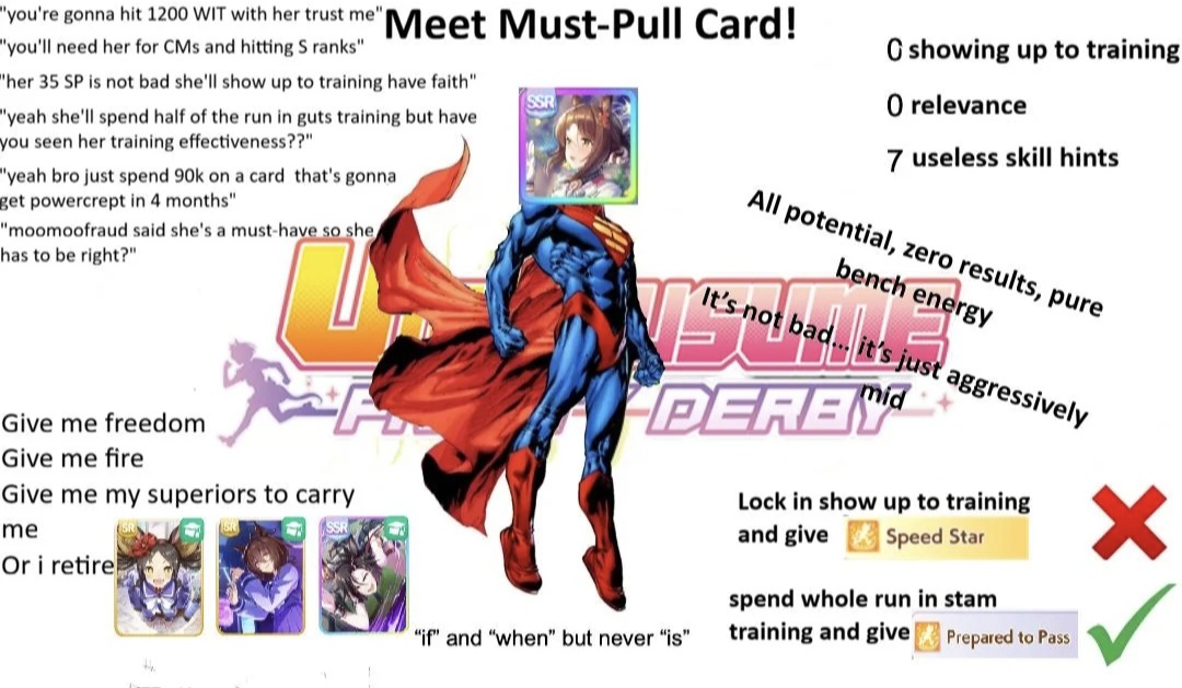 >got 2 Kitasan from free rolls>best card is Kita so I can't even use herthis was smart, now """""they""""" gave me 2 SSR I can't even use and just took away 2 potential "I actually want this Uma" slots in my future pulls. It's a classic case of giving you something to make them seem generous knowing full well you can't use it. It's like giving a free carwash to a guy with no car. Fuckers think they are so smart doing this to me I don't know how the fuck they can get away with this blatant shit and just come out and say they are doing this outright without going unpunished. They need to pay for this underhanded bullshit.
