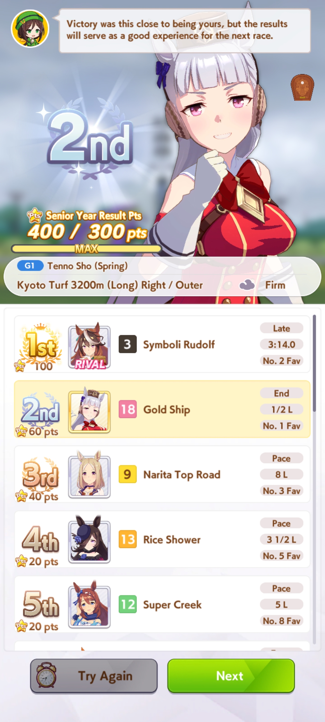 >>561128749You do understand that the whole point of front runners is to establish largest possible lead in early-mid race? They have the lowest late race top speed for a reason.
