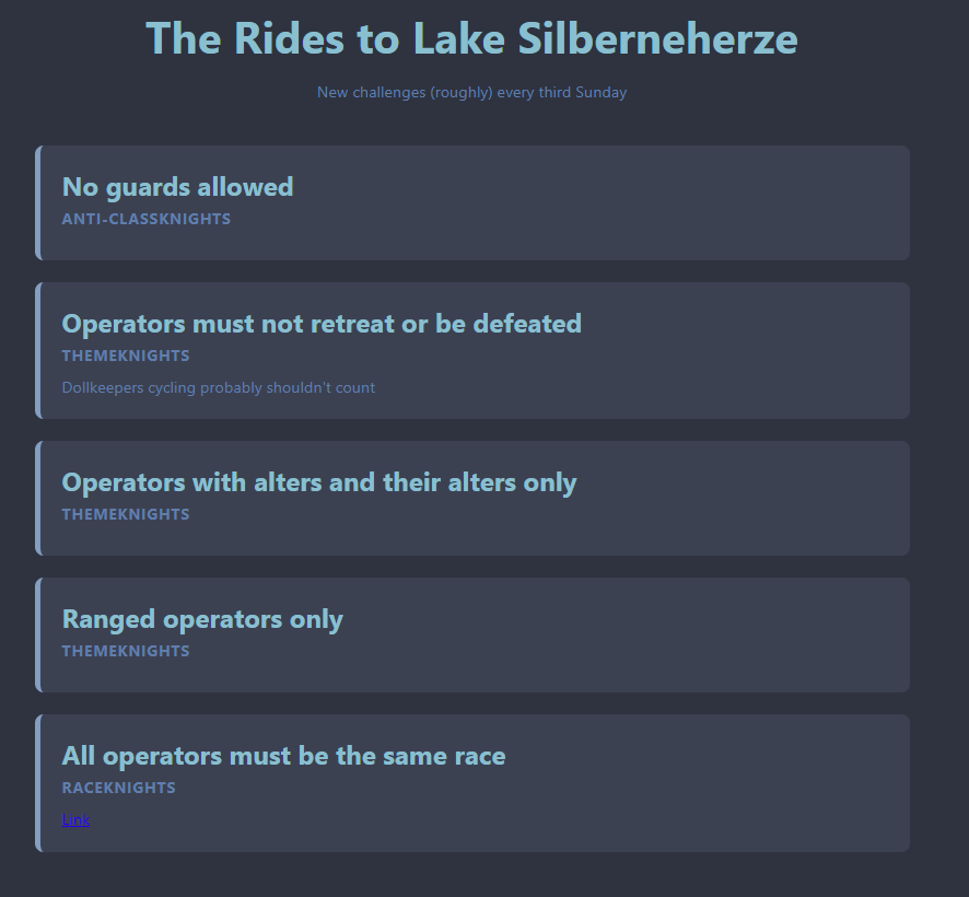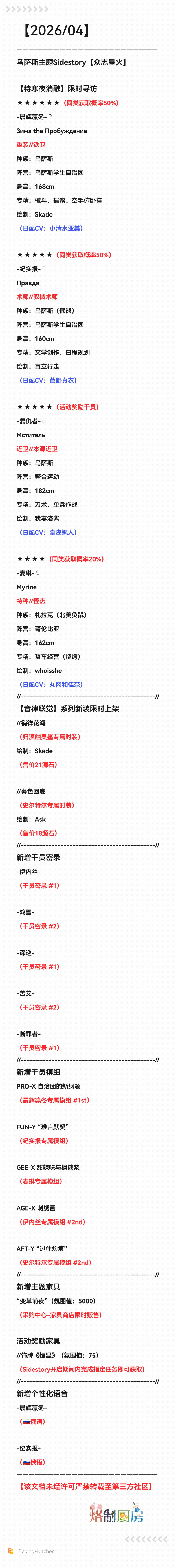 Previous thread: >>561124124Happy birthday to Mizuki!>CURRENT, FUTURE GLOBAL/JP/KR CONTENT:[3/19-4/2][The Silent Wavelengths]6* Caster Mantra, 5* Vanguard Poncirus, 5* Defender Vetochki, 4* Vanguard Snegurochka[3/13-3/27][Standard]6* Guard Executor The Ex Foedere, 6* Defender Horn (Shop), 5* Supporter Sand Reckoner, 5* Supporter Lucilla, 5* Guard Leto (Shop)[3/9-3/24][Kernel]6* Caster Eyjafjalla, 6* Sniper Schwarz (Shop), 5* Specialist Projekt Red, 5* Vanguard Chiave, 5* Sniper Executor (Shop)[3/6-3/27]Rebuilding Mandage - Puzzle skin[3/6-3/27][Crossover Outfits]Eyjafjalla, Lumen, Executor The Ex Foedere, Goldenglow, Lee, U-Official[3/18-4/2][Storyboard Breaker]Narantuya, Mitm, Greyy The Lightningbearer, Haze>CURRENT, FUTURE CN CONTENT:[3/12-3/26][Standard]6* Medic Reed the Flame Shadow, 6* Specialist Dorothy (Shop), 5* Guard Gracebearer, 5* Sniper Snow Hunter, 5* Sniper Melanite (Shop)[3/10-3/24][By My Rule]6* Guard Bellone, 5* Caster Ripresa, 5* Defender Cement[3/10-3/24]Leizi the Thunderbringer, Raidian, Papyrus[3/10-3/24][Skin reselling]Nymph, Valarqvin, Sesa, Dur-nar[3/14-4/25]Stronghold Protocol: Alliance - Mousse skin>/akg/ website:akgcc.github.io>AK EN Database:puppiizsunniiz.github.io/AN-EN-Tags/akhrchars.html>More valuable resources:rentry.org/akg_resources>/akg/ merch guiderentry.co/akg_merch
