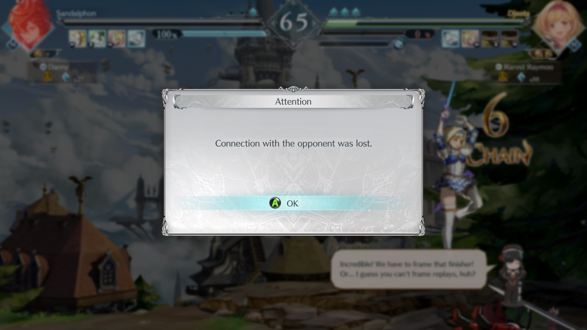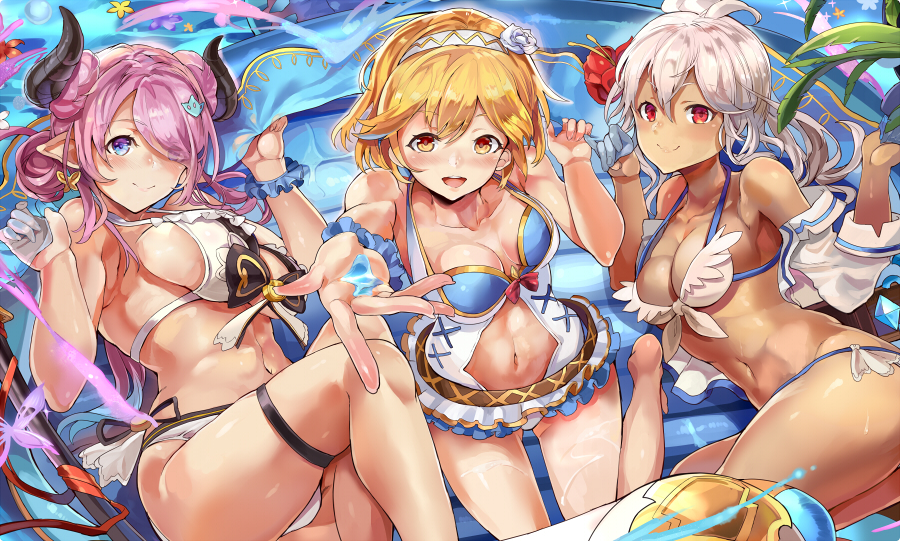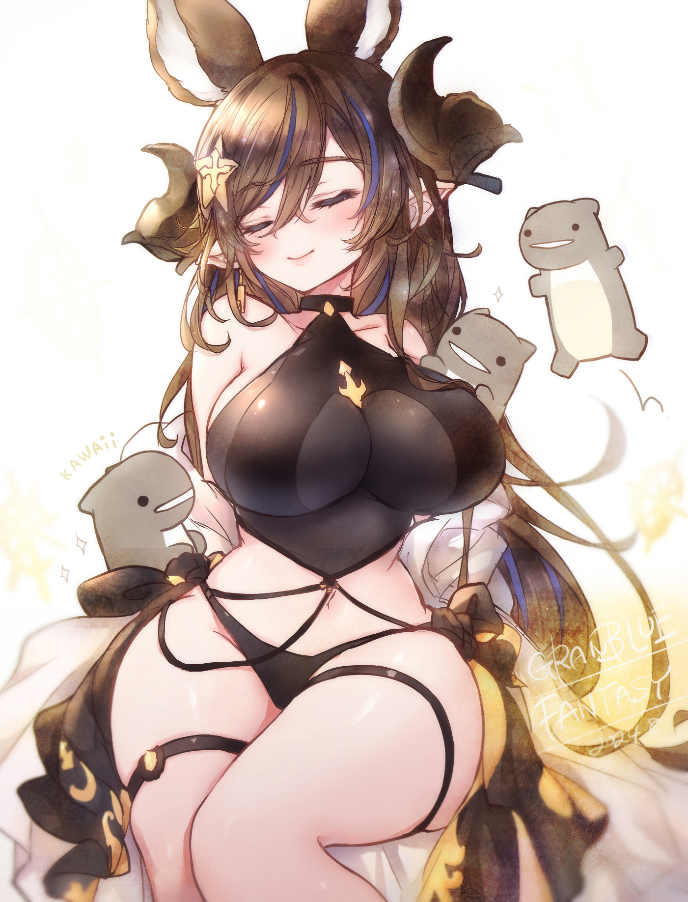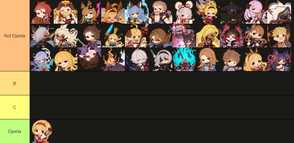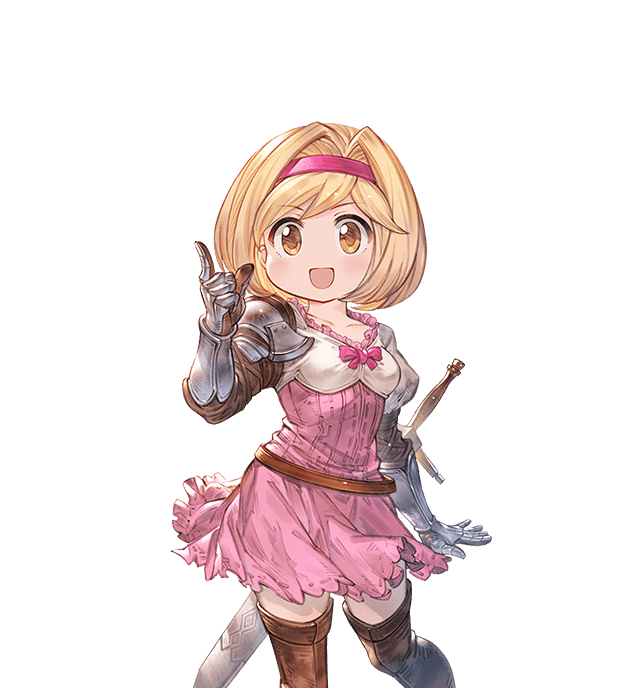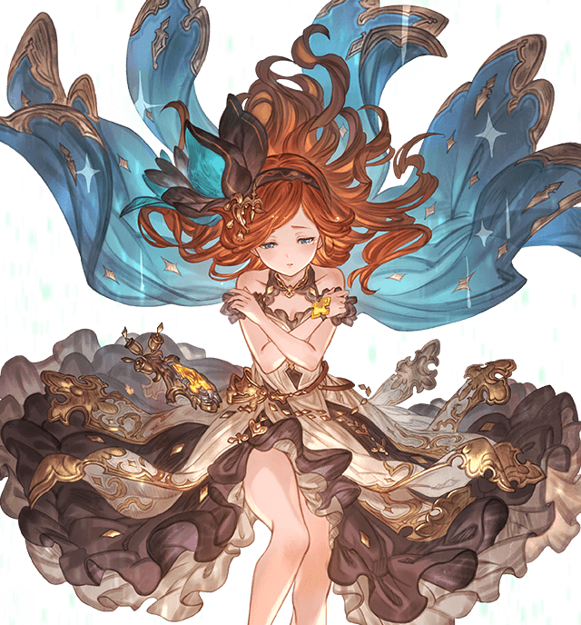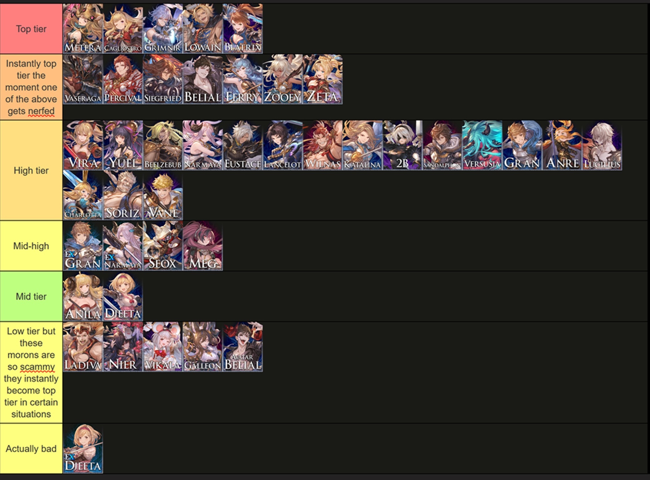 Gran, Djeeta, Narmaya, Charlotta, Ladiva, Ferry, Anila, Vikala, Zooey, Versusia, Siegfried, Percival, Vane, Lancelot, Seox, Anre, Eustace, Beatix, Vaseraga, Zeta, Galleon, Grimnir, Metera, Lowain, Katalin, Vira, Yuel, Soriz, Cagliostro, Wilnas, Ilsa, Sandalphon, Nier, Beelzebub, Lucilius, Avatar Belial, not 2B, and Meg