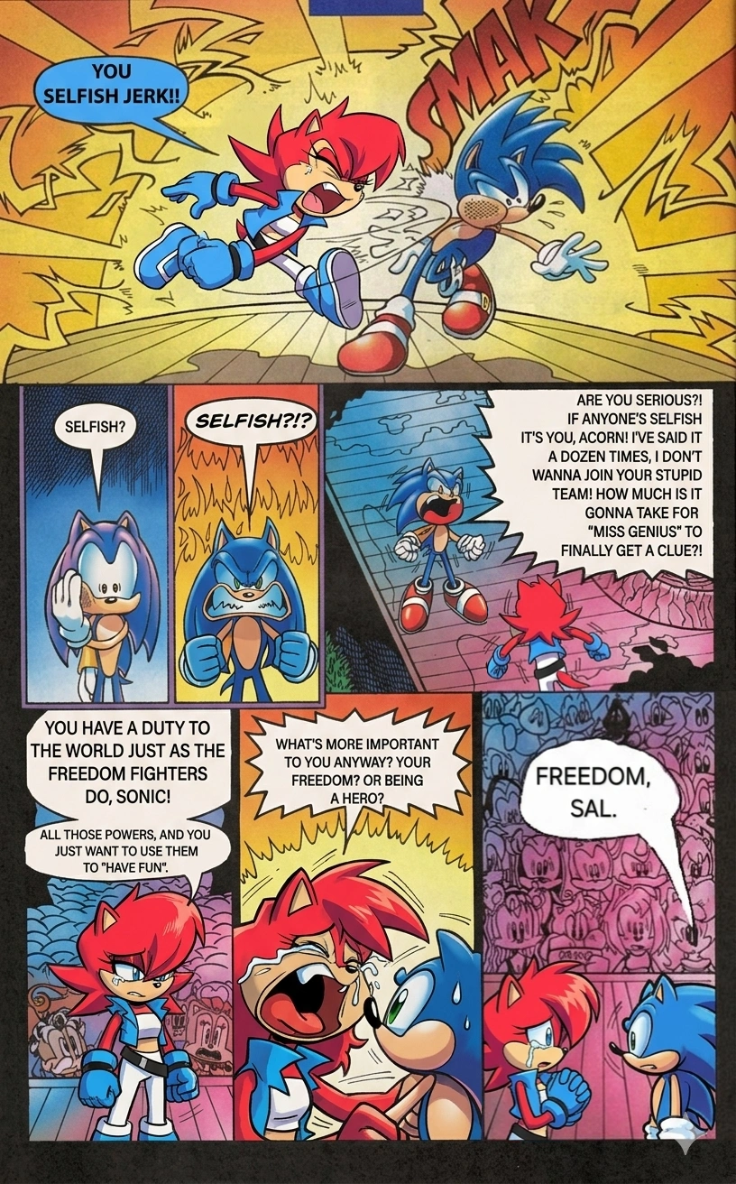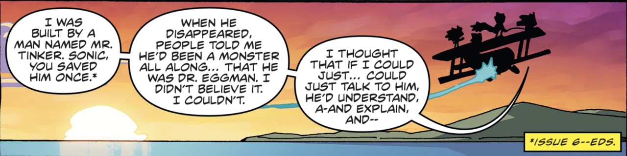 >>561177367>I meant it when I said you're free to go your own wayThe comic is cool but this part just annoys me. Tails always did that, he didn't need Sonic's permission