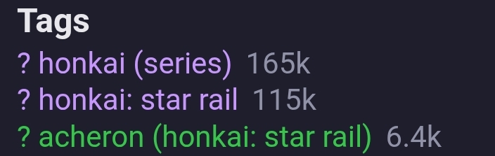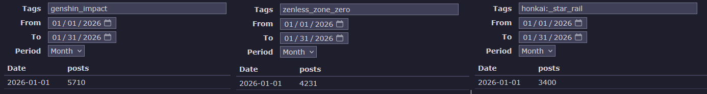 >>561212003In the last 30 days on Danbooru>Genshin got ~5800 posts>HSR got ~3800>ZZZ got ~4000>Blue Archive got ~9000>FGO got ~3000