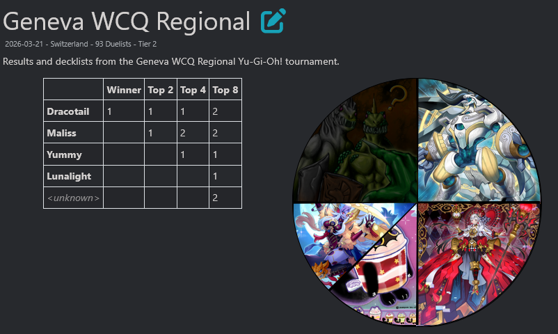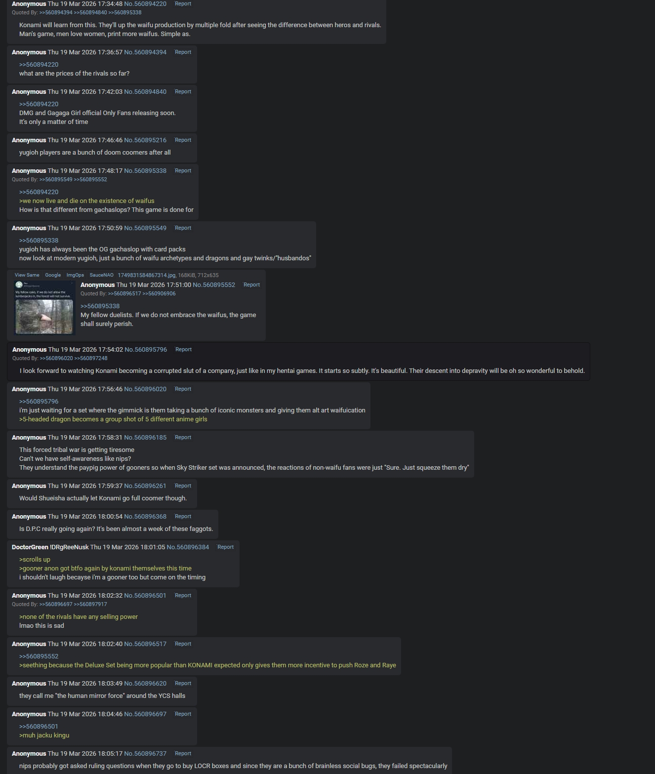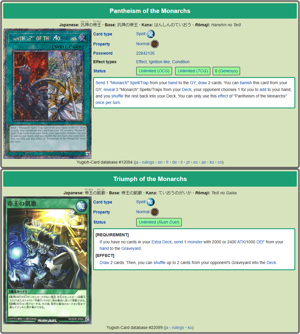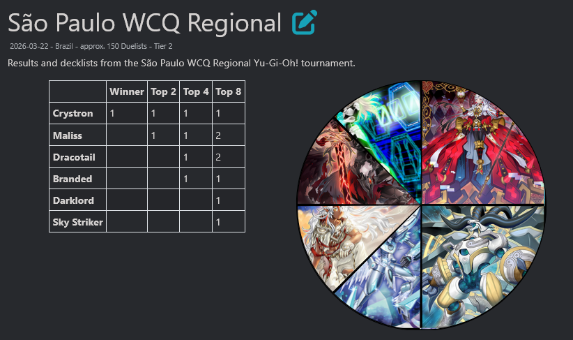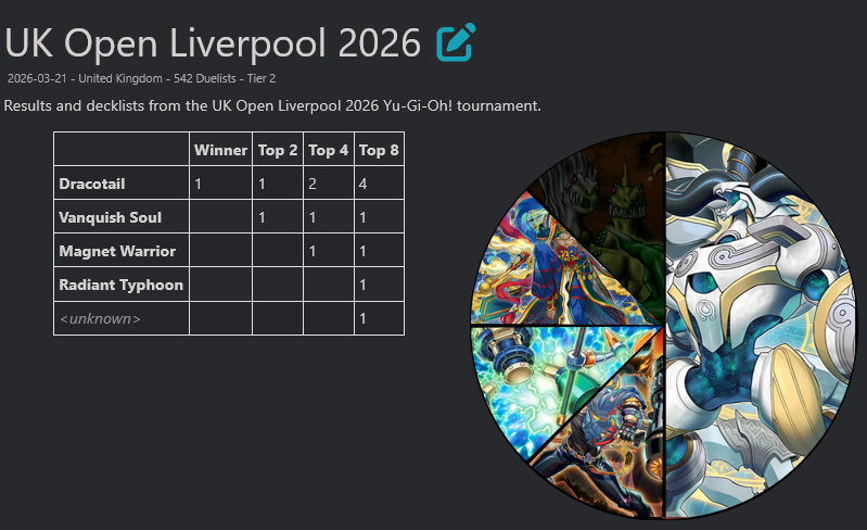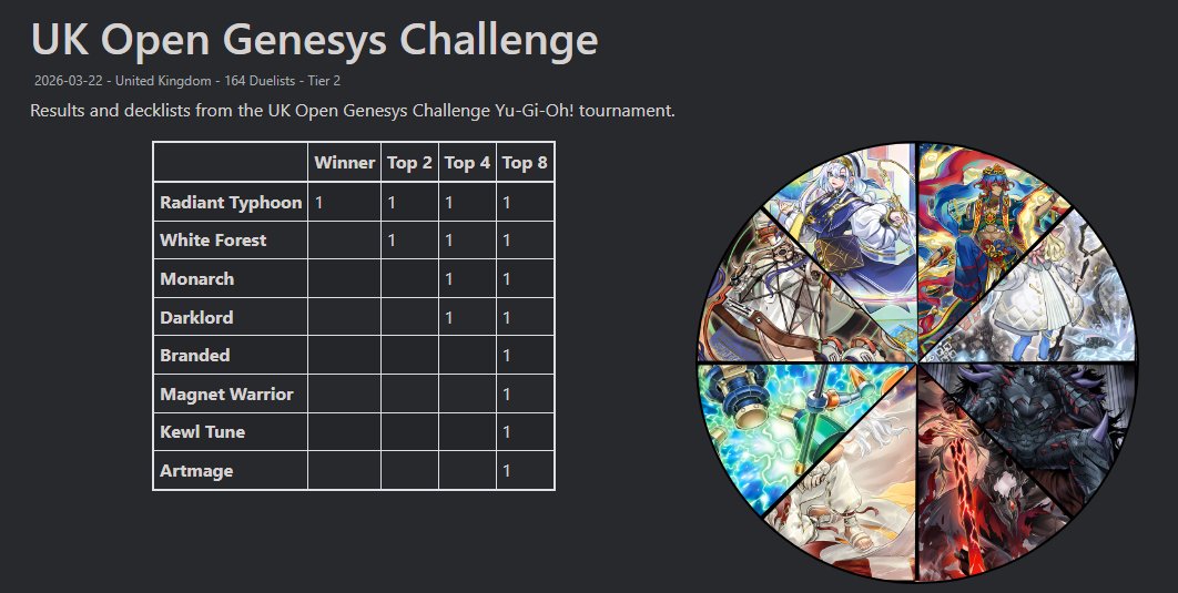 #6791 - Thunder shilling EditionPrevious: >>561149157>SimulatorsAutomated:●EDOPro (PC/Android): https://projectignis.github.io/download.html●Master Duel (Multi-plat): https://store.steampowered.com/app/1449850Manual:●Duelingbook (online): https://www.duelingbook.comTag: “/dng/” Password: “vidya”; on EDOPro, specify server.Genesys Duels: MR5, TCG, Custom Rules: No Links/Pend/EMZ/Pend Zones>LinksRulebook: https://www.yugioh-card.com/en/rulebook/Wiki: https://yugipedia.comProbability Calculator: https://yugioh.fyiStock Market: https://yugiohprices.comDatabase: https://www.db.yugioh-card.comMisc Info: https://www.formatlibrary.comBlog:https://yugiohblog.konami.com/Alt Format:https://www.yugioh-card.com/en/genesys/>BanlistsTCG: https://www.yugioh-card.com/en/limited/list_2026-02-02/ (Feb 2/Next List: TBA)OCG: https://yu-gi-oh.jp/news_detail.php?page=details&id=2488 (April 1/Next List: July 1)>DecklistsOCG: https://roadoftheking.com https://tonamel.com/competitions?game=yugioh_ocgTCG: https://ygoprodeck.com/category/decks/tournament-meta-decks>NewsJP: https://yugioh-starlight.comEN: https://ygorganization.com>Upcoming SetsOCG:●Valuable Book EX6 (Mar 19)●LIMIT OVER COLLECTION -THE RIVALS- (Mar 20)●Chaos Origin (Apr 25)●REVOLUTION BOOSTER -Toon Witchcraft (May 30)●World Premiere Pack 2026 (Jun 27)●Beyond the Brave (July 18)●Deluxe Duel Set - Sky Striker (Late Aug)TCG:●Rarity Collection 5 (Apr 10/Apr 17 for NA/LATAM)●Blazing Dominion (May 8)●Battle of Legends: Glorious Gallery (Jun 5)●Chaos Origin (Jul 3)>Events●Chaos Progression (Apr 5, 2000 UTC):https://challonge.com/DNGChaosProgression1