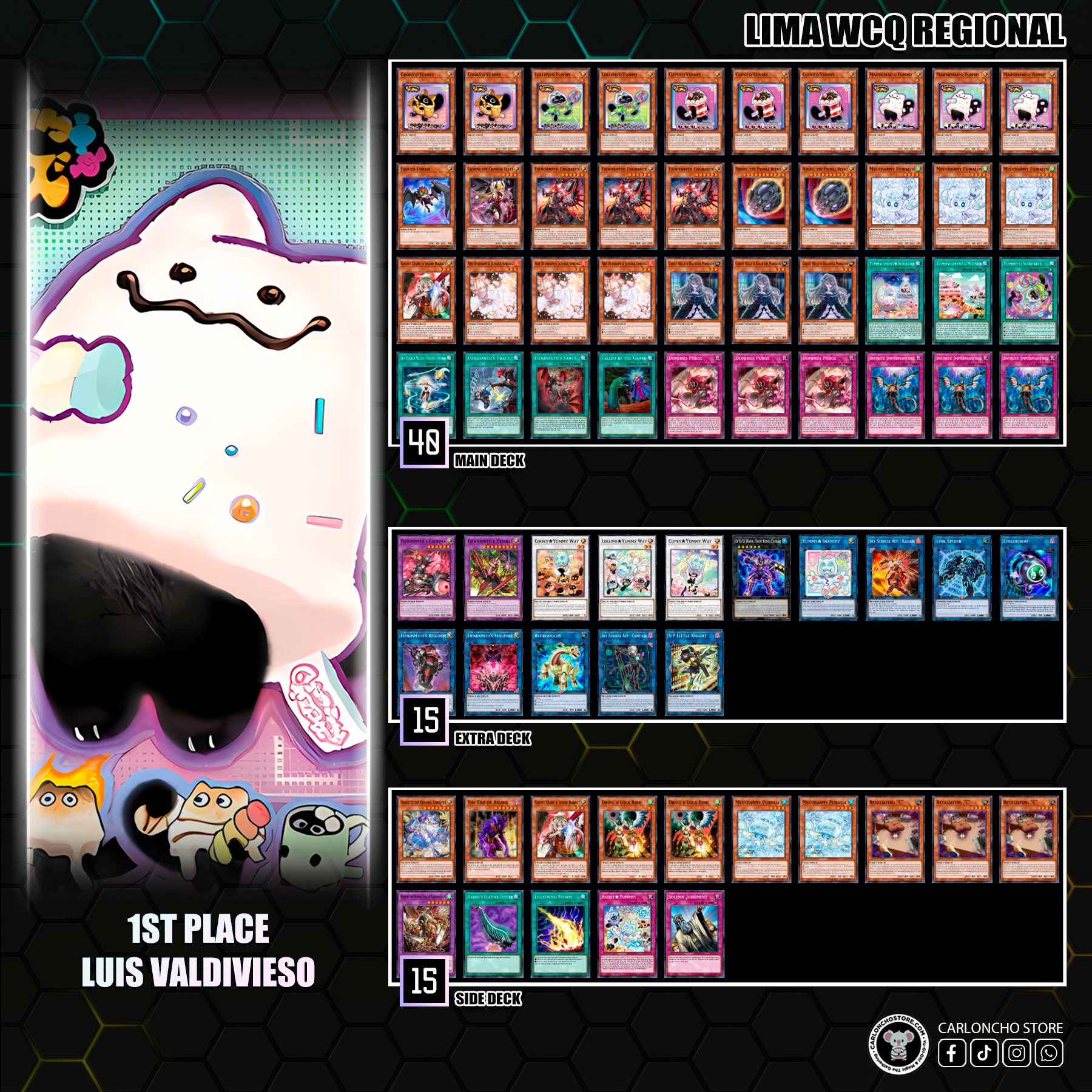 Lima WCQ RegionalTop 8 Decklists1er Lugar: Luis Valdivieso (Yummy Fiendsmith)2do Lugar: Renato Romero (Yummy Radiant Typhoon Tri-Brigade)3er Lugar: Gerardo Delgado (Radiant Typhoon)4to Lugar: Jonathan Malaga (Yummy Fiendsmith)5to Lugar: Jose Amaya (Radiant Typhoon)6to Lugar: Renato Sarmiento (Dracotail Branded)7mo Lugar: Santiago Sturmo (Maliss)8vo Lugar: Gabriele Villanueva (Radiant Typhoon).-No de participantes: 232