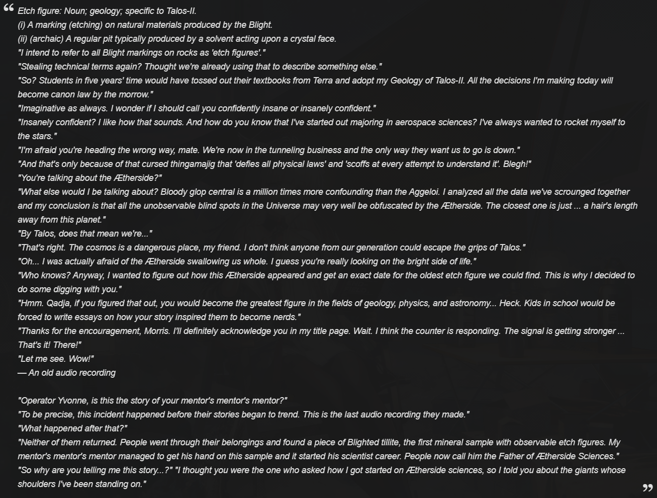 > OMV Dijiang is a spacecraft in geostationary orbit above Talos-II. It is the current headquarters of Endfield Industries.>Humanity lost their lifeline to Terra when the Æthergate collapsed and the First Aggeloi War broke out. In the moment of despair against this sudden threat, human factions that included the UWST, HAS, and TGCC jointly initiated several research projects. OMV Dijiang was one of them.>After a series of events, Endfield Industries became part of humanity's war effort. Many rare and non-renewable tech resources were used to construct Dijiang in Talosian orbit. This was a feat of technological marvel that could never be replicated.Huh I thought we came to Talos on the Dijang, but turns out it was a Talos vessel. So Terran hasn't even figured out space travel yet?