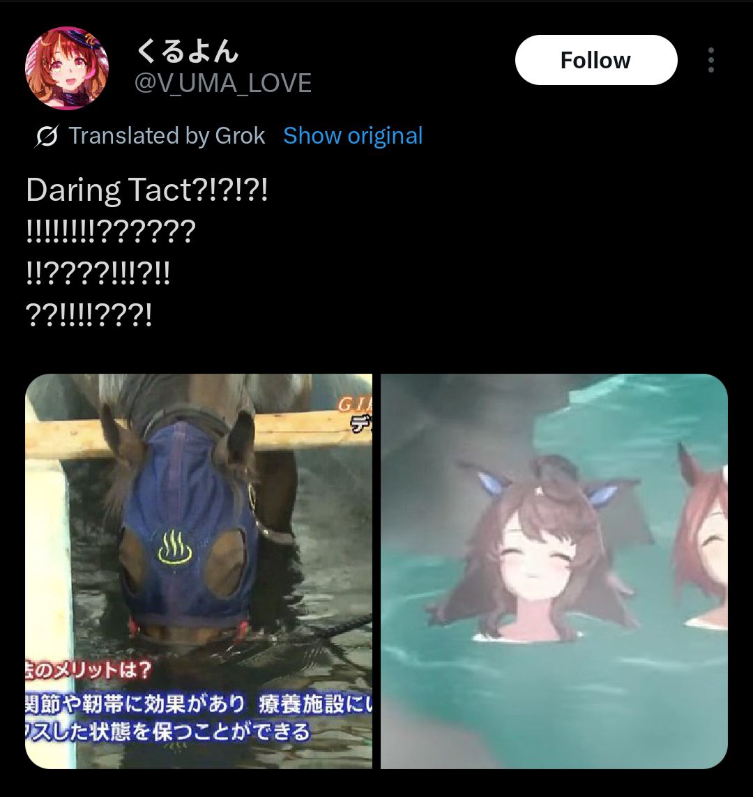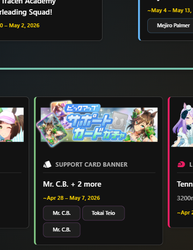Previous: >>561213207>Global Game NewsLink your account to Cygames iDCurrent Scenario: Make A New Track aka "Trackblazer"Current Rate Up Trainee: Kitasan Black (3*), Satono Diamond (3*), Matikanetannhauser (2*)Current Rate Up Support Cards: SSR Narita Top Road (Speed), SSR Marvelous Sunday (Guts), SR Admire Vega (Guts), SR Mejiro Ryan (Stamina), SR Bakushin (Power), SR Curren Chan (Speed)Current CM: Pisces Cup - Hanshin Turf 3200mhttps://umamusume.com/news/632/03/02 - 04/14 - Halved TP Cost & 2x Career Mode Rewards03/12 - 04/15 - Paid 3* & SSR Selector available in Carats Shop03/12 - 03/24 - Free Daily 10-Scout03/12 - Flying Run-Up! Story Event03/22 - Satono Diamond (3*), Curren Chan (SSR), Marvelous Sunday (SSR)03/23 - First Anniversary Part 303/23 - Agnes Tachyon, Narita Taishin, Narita Brian legends races03/26 - First Anniversary Part 403/26 - Mejiro Bright (3*), Curren Chan (SSR), Zenno Rob Roy (SSR)03/26 - 04/05 - Pisces Cup - Long/Right/Spring/Heavy/3200https://pages.snep.pw/uma/anni-skill-changes/>JP Game NewsCurrent Rate Up: Victoire Pisa (3*), AI-Chan (3*), SSR Yanko, SSR CasinoNew Scenario "Beyond Dreams" releasedTimeline: https://uma.moe/timelineCygames Webstore: https://webstore.cygames.com/en/umamusume_en/>Thread Clubshttps://rentry.co/umaglobalclublistYou must be E3 (20k points) to join a circle. Apply with /uma/ or /vg/ in your profile or post ID in the thread.>All Guides & Resourceshttps://rentry.org/uma26Game databasehttps://gametora.com/umamusume (Click the gear to switch between JP / global server info)A basic guide for newfagshttps://rentry.org/umaglobalFind networks if your region is blocked from the game or clienthttps://www.umavpn.top/Seiyuu & Concertshttps://rentry.org/umstUmamusume Birthday Calendarhttps://ウマ娘.攻略.tools/events/birthdayUma Texthttps://umareader.idsmile.xyz/