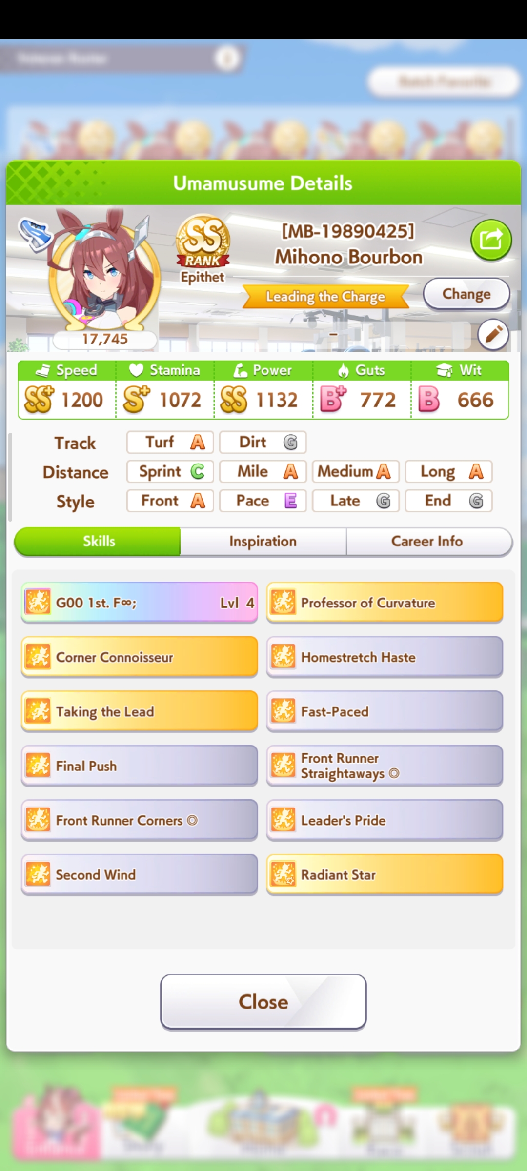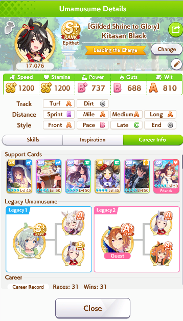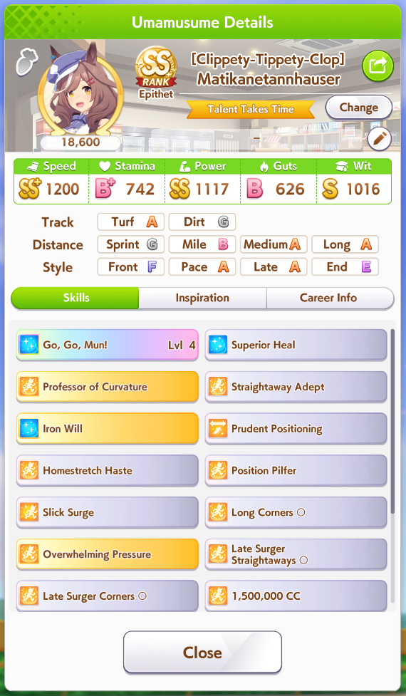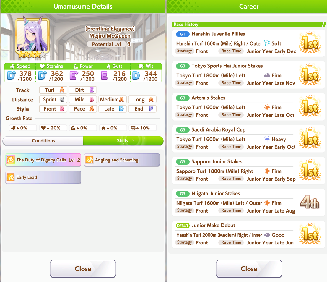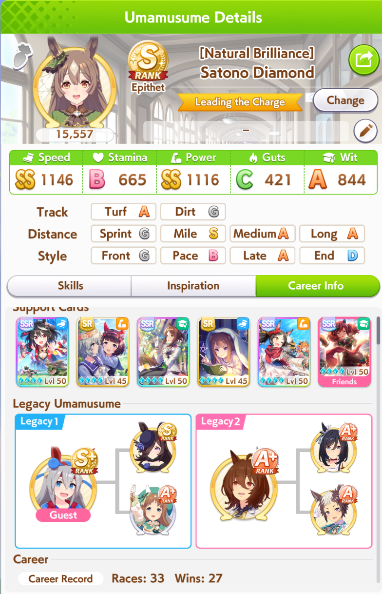 >>561244806Mile A really helps too. I was doing Kita runs last night, finally bit it and brought her to A and borrowed Fuku, that +150 stats massively helped her win all the junior year races