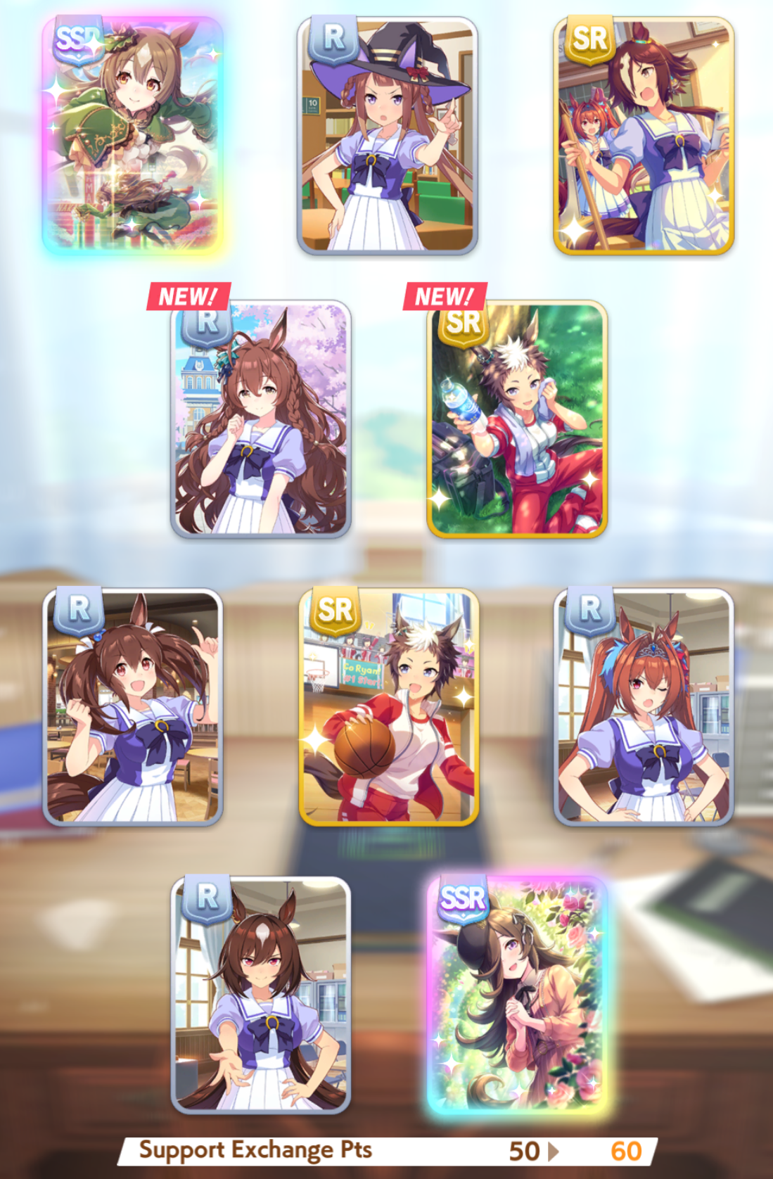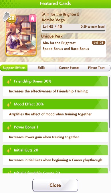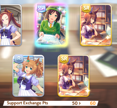 Current Rate Up Support Cards: SSR Narita Top Road (Speed), SSR Marvelous Sunday (Guts), SR Admire Vega (Guts), SR Mejiro Ryan (Stamina), SR Bakushin (Power), SR Curren Chan (Speed)