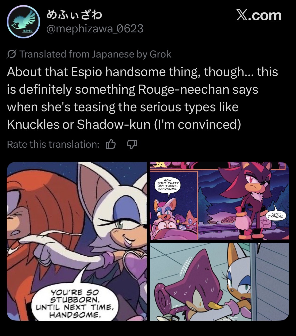 >>561276825>IDW writers be likeThis is dumb. Shadow was hardly like this in SA2, when he was on a suicide mission, and he grew tremendously in his interpersonal skills over the course of Heroes and 06. The "ow the edge" meme being accepted as his actual personality is a cancer that needs to die. It sucked when Shadow (05) did it, it sucked when Boom did it, and it sucks when IDW does it.>>561276767Cute outfit, cool concept.>>561276973Spot on. I came to understand this about a year ago.