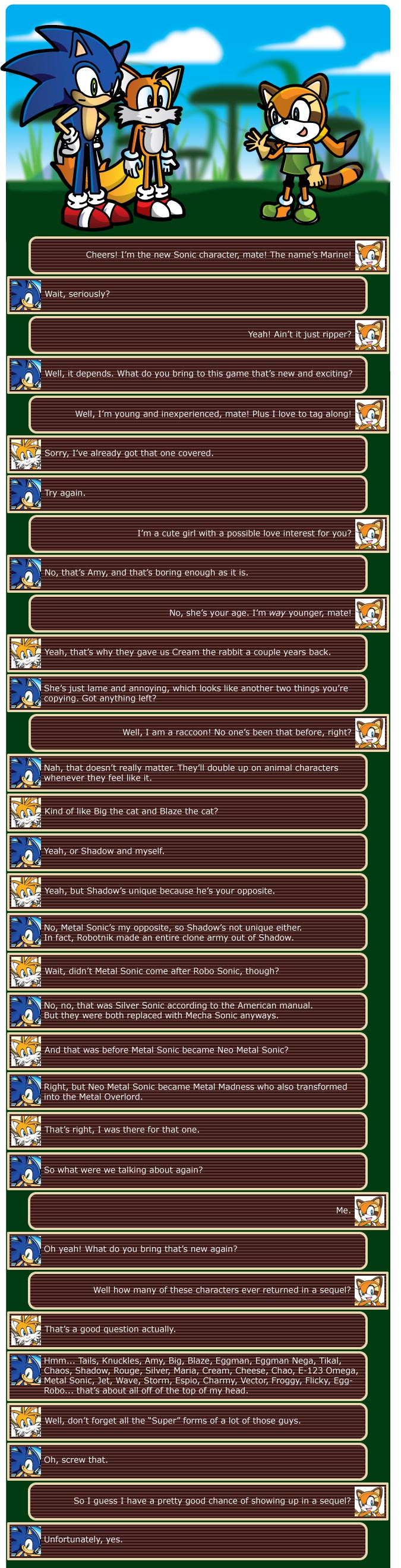 >>561278759>It isn't ooc, but Sonic staying with her and raising their child is.This. Sonic's a free spirit. Hooking up's A-OK with him.