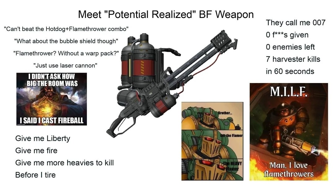 >>561292296If you wanna go flamer, is it better to get the Support Flam, the Torcher, the Crisper, or something like the Stoker? They all seem to have identical range and damage, just different capacity.