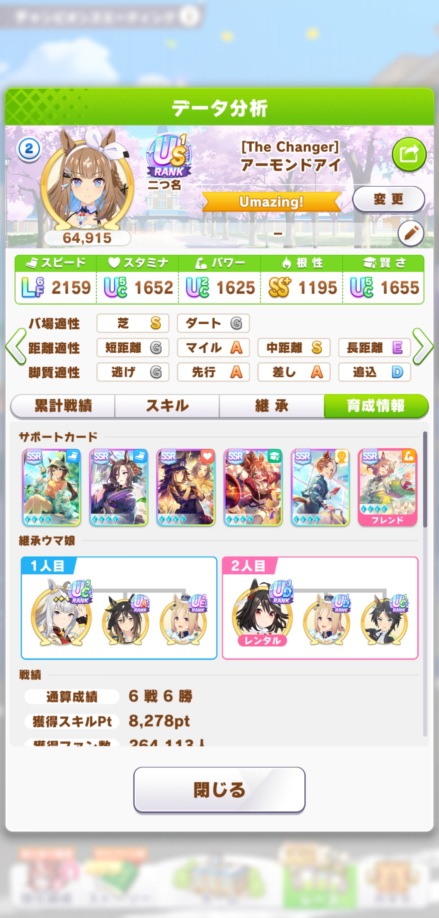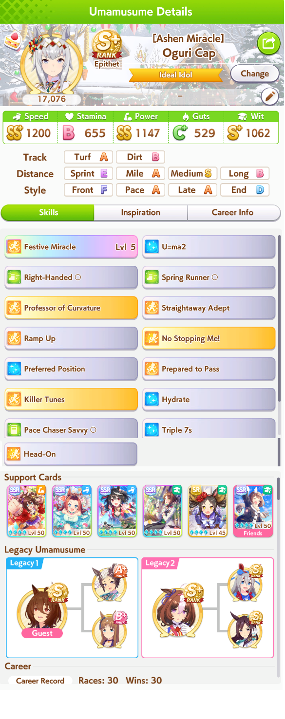 >>561433445No good stamina cards at all is rough. Though for your Stego, I think it's far better to use use Creek as your Stamina then borrow either Fine or Yuni Power depending on your Stamina stat looks like in the end.For your Orfe, borrow Yuni instead and do Ai and Aruvu Double Speed taking out Stego Guts. Dorija Speed has gone by the wayside now.