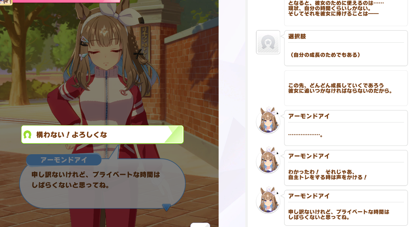 This is why you should follow Mirako's example and just enjoy your school life instead of betting it all on racingtism. >>561448976Ai is a psychopath. At this point, I'm still not sure if she's better or worse than Tacto with her Ainu lifestyle.