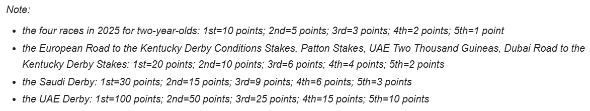 >>561446336EU/ME road get two entries so first 2 finishers of UAE Derby pretty much guaranteed KD entry by how much pts they get