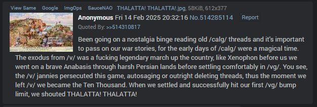 >>561340176The quality of Coffin threads on /v/ took a nosedive due to the advent of haggotry around 2024/2025, but the early days were the greatest discussion on /v/ in years. /calg/ was founded here in /vg/ by the Ten Thousand from those very /v/ threads, and we brought our excellence with us.