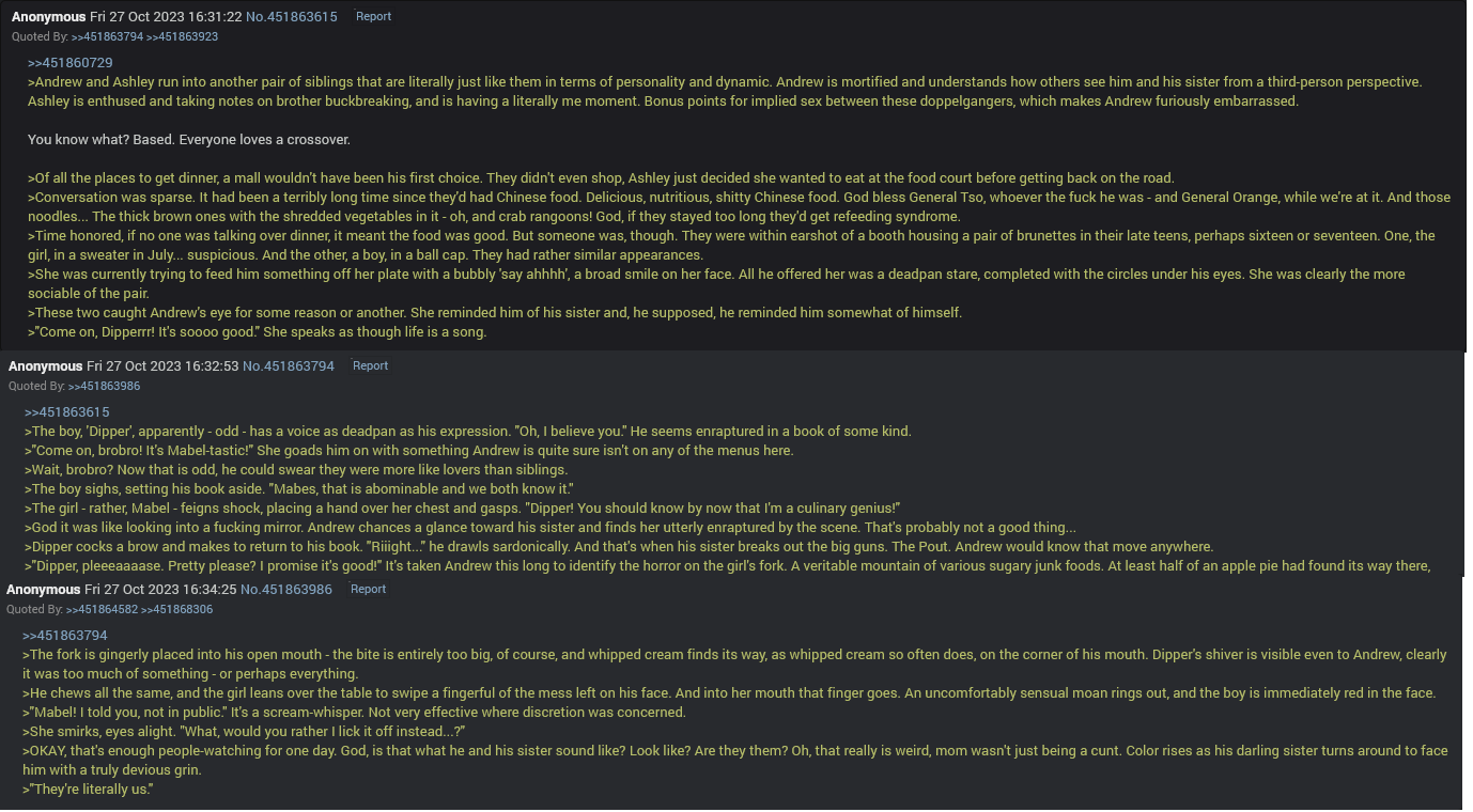 >>561340146>NemleivaniaI dont even know what that means since im a little bit of a Newfag here but the basic plot tldr is as soTwo siblings, one 22 the other 19 grew up in an incredibly rural self sufficient family in the wilderness and ended up in a romantic and sexual incestuous relationship since they were the only people of the opposite gender of the same general age that they knew their entire lives. Older brother turns 18 and wants to figure out his purpose in life and shit and so randomly one day moves to the city to do that and the sister ends up following suite and sharing an apartment with him. Brother wants to put all that in the past and just be basic close siblings eith her but sister still wants to be how they always have been and stay together forever due to fear of abandonment making her possessive of himTheres a lot of nuance and small details I left out since its a tldr but thats sorta it